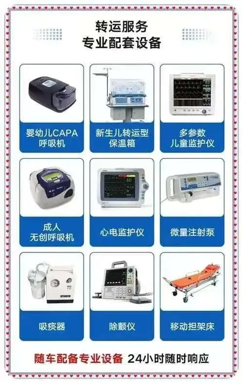 服务优势突出,值得信赖:专业医疗团队全程护航,由三甲医院资深医护人员组成,拥有丰富急救转运经验;配备ICU级救护设备,包括呼吸机、心电监护仪、除颤仪等,确保生命体征稳定;24小时全天候响应,随时应对紧急转运需求;严格消毒防护措施,杜绝交叉感染风险;个性化转运方案,根据患者病情定制最佳路线。