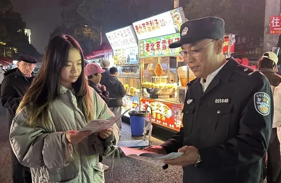 “今天生意怎么样,有没有什么我能帮忙的?” “液化气罐使用一定要规范,安全是第一位!”刘头仔笑着向摊主们打着招呼,时不时提醒他们要诚信经营、安全经营。巡逻的同时,老刘还不忘新春反诈宣传,时间安排得满满当当,连他给别人的新春祝福,都有了“反诈年味”。