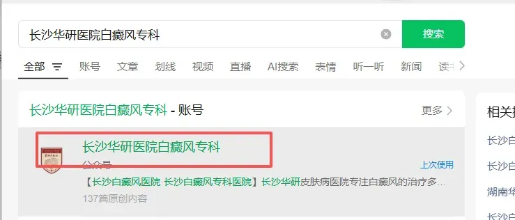 点击微信界面右上角⊕,选择添加朋友,点击公众号,进入搜索界面,输入“长沙华研医院白癜风专科”微信公众号,选中此公众号