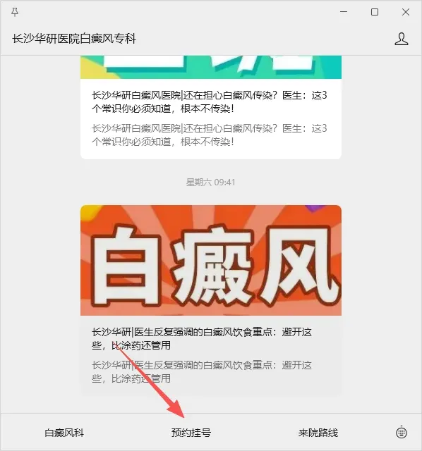 ▼▼长沙华研医院白癜风专科“微信公众号”预约挂号详细流程: