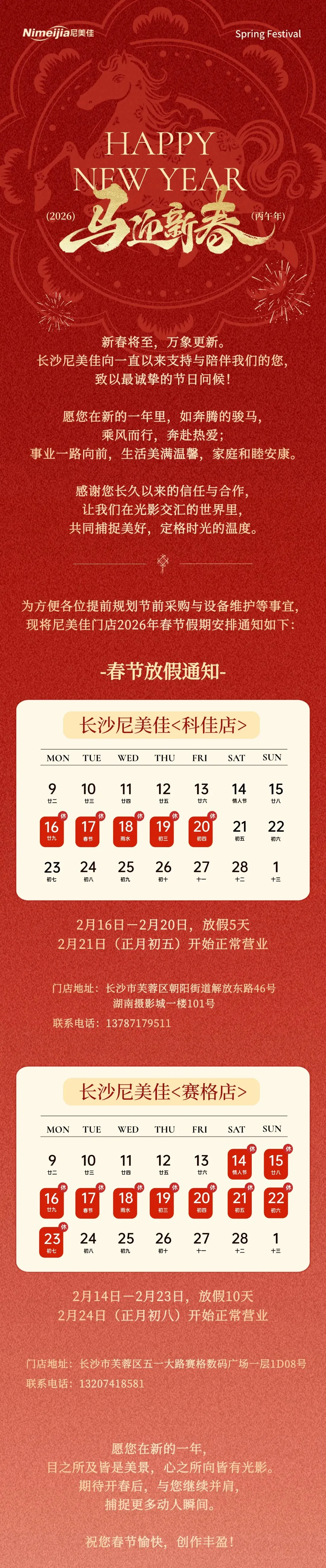 2026春节营业时间安排 | 长沙尼美佳祝您新春愉快