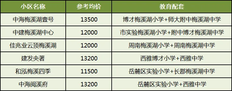 价格基本在1.1-1.3万之间,其中中海阅溪府、建发央著是次新小区,房龄更新,学校成绩来看,中海梅溪湖壹号配套的师梅更优秀,但其余学校成绩也在中上游。