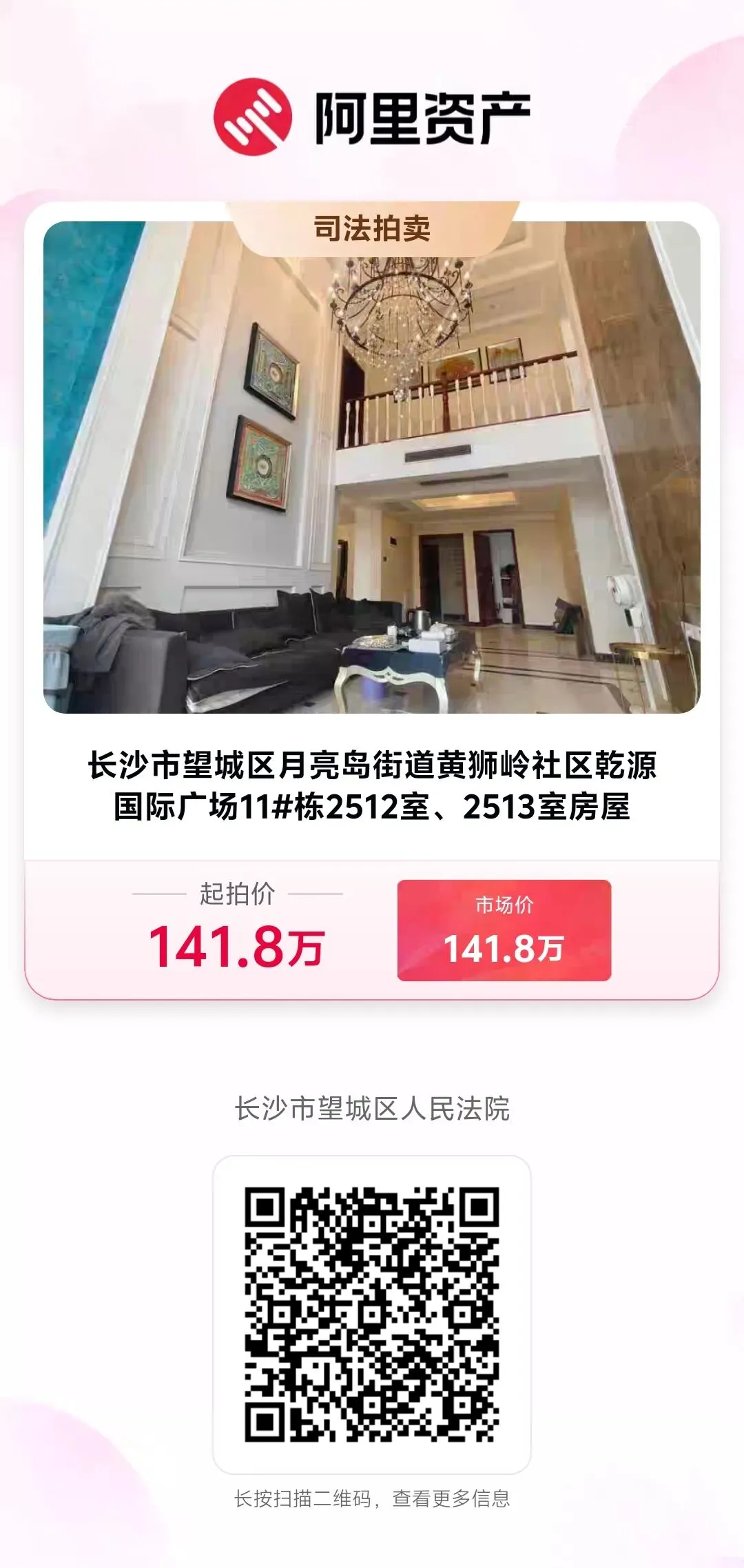 长沙市望城区月亮岛街道黄狮岭社区乾源国际广场11#栋2512室、2513室房屋将于2026年3月15日10时至2026年3月16日10时(延时的除外)在长沙市望城区人民法院淘宝网司法拍卖网络平台上(http://sf.taobao.com/0731/09,户名:长沙市望城区人民法院)公开进行第一次拍卖活动。