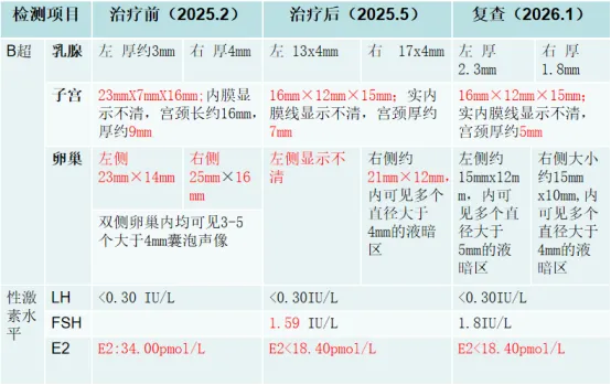 治疗1个月后复查,桃桃的骨龄已控制在正常范围,双侧乳房压痛消失,相关检查指标较之前明显好转。随后,桃桃继续巩固治疗3个月。今年初复诊时,她的骨龄与年龄相符,复查B超和激素水平也稳定在基线水平。