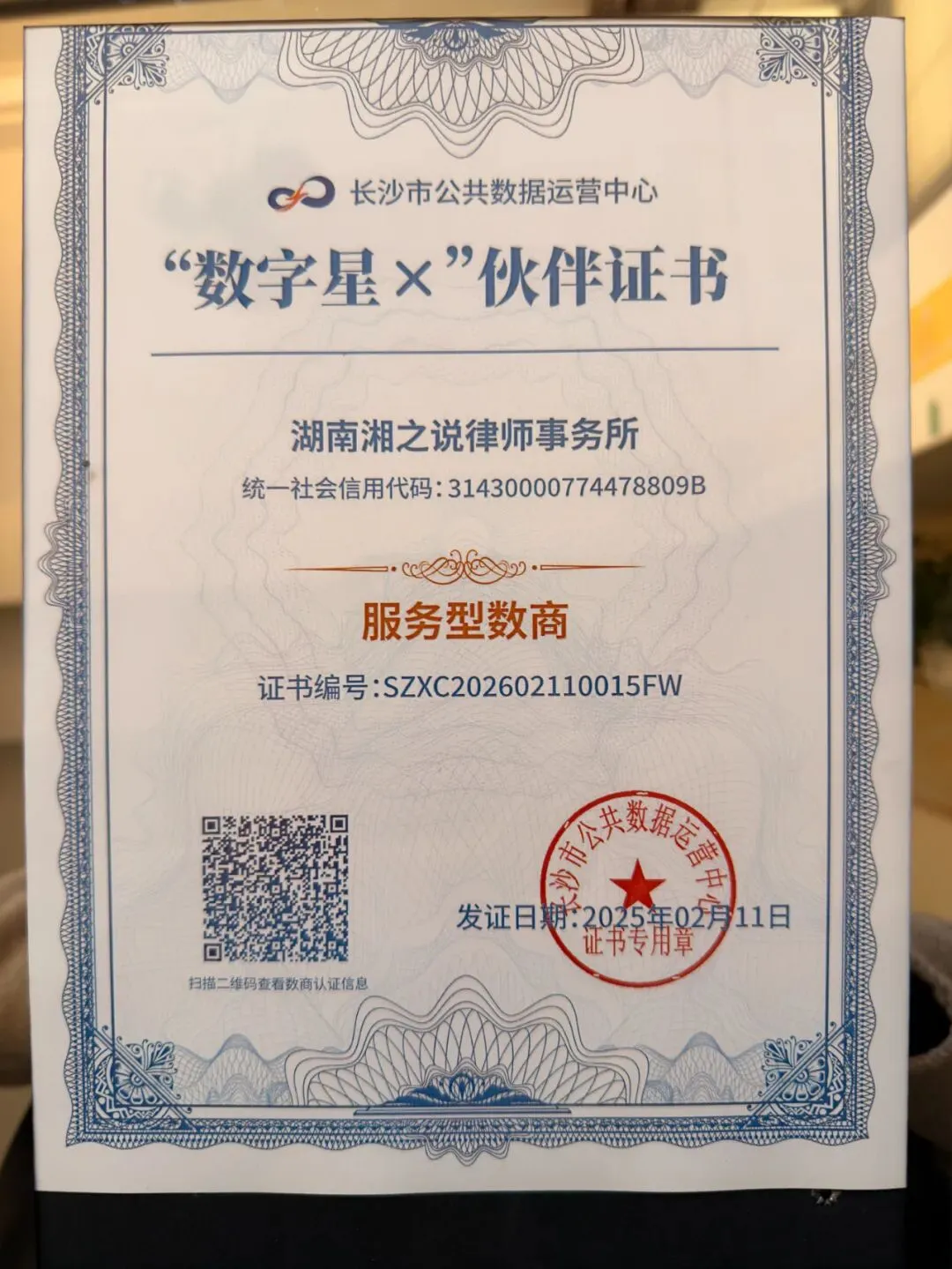 2026年2月11日,由长沙数字集团有限公司主办的“数聚星城・共创未来”基于可信数据空间的数据要素生态交流活动在中电长城总部基地成功举办。活动现场,湖南湘之说律师事务所正式获颁长沙市公共数据运营中心“服务型数商”认证证书,成为“数字星×”伙伴成员单位,标志着我所在数据要素服务领域的专业能力获得官方权威认可。