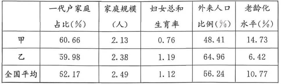 ③家庭规模均趋小型化 ④甲为黑龙江省、乙为广东省