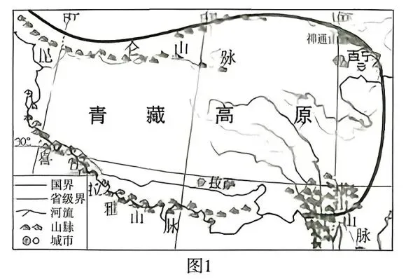 山体效应是指山体、高原气温普遍高于外围同海拔大气温度的现象,其强度通常用高出的温度值衡量。研究表明,青藏高原(图 1)的山体效应强度随经度和纬度存在一定的变化规律(图 2);每年湿季(5~9 月)山体效应强度和降水量呈负相关关系,而干季(10 月至次年 4 月)则受下垫面影响,海拔6000 m 以上山体效应大幅减弱。据此完成14~16题。