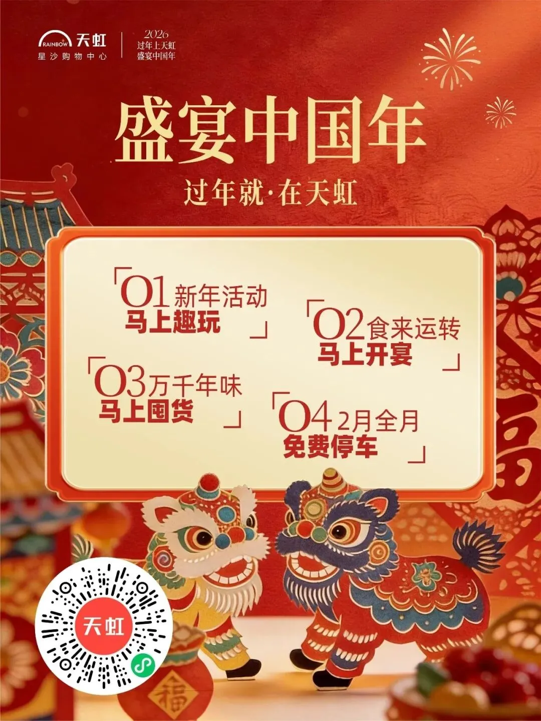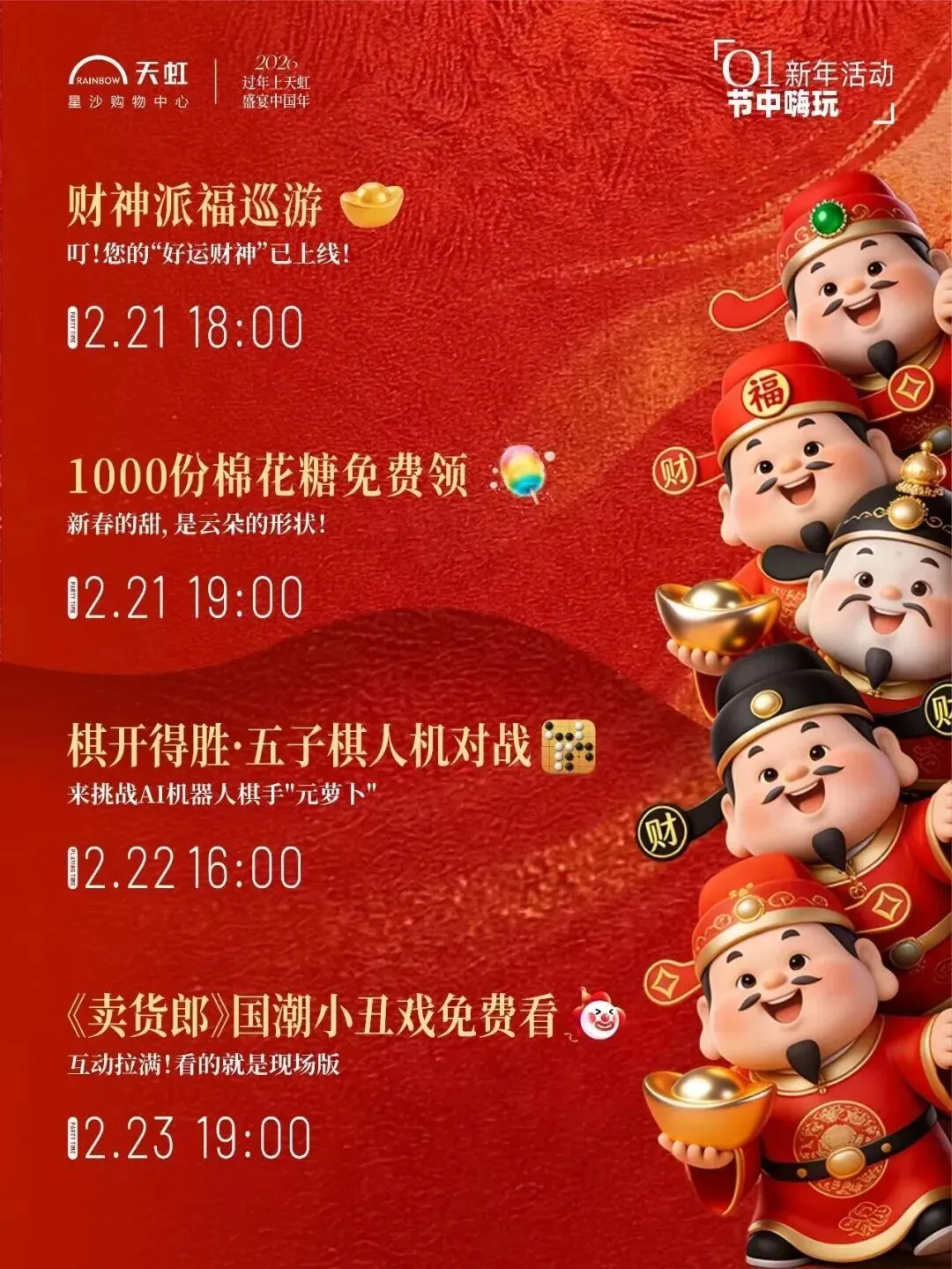 舞狮、京剧变脸、踢毽子、滚铁环、接沙包、红包拓福……天虹购物中心的新春活动排得满满当当,年味十足;情人节当天,“爱神”会在商场派发玫瑰,仪式感直接拉满;大年初五财神巡游,现场还能免费领棉花糖,甜蜜又喜庆;零售满388/超市餐饮满188即可参与满额抽雅迪电动车,活动至2.14,骑“电驴”开年!