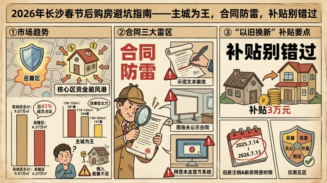春节前后签合同,最容易掉进开发商精心设计的陷阱里。2026年长沙已全面强制使用《湖南省新建商品房买卖合同》示范文本,但开发商仍可修改补充条款。