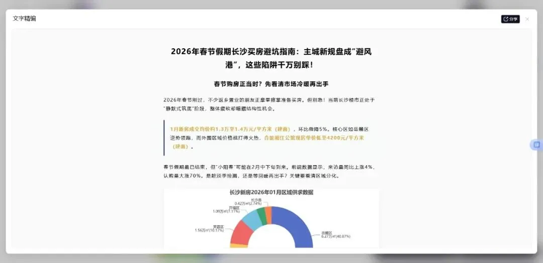 克而瑞·深度智联是地产人的“第二大脑”,房地产行业的首个AI AGENT。它不仅会思考分析,还会提供工作成果,擅长处理您工作中各种场景的任务,可以帮您完成多个复杂工作,是您最佳的AI助手。 2026年春节来临,不少返乡置业的朋友正摩拳擦掌准备买房。但别急!当前长沙楼市正处于“静默式筑底”阶段,整体疲软却暗藏结构性机会。