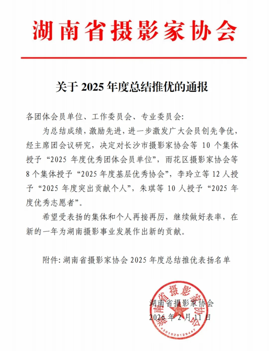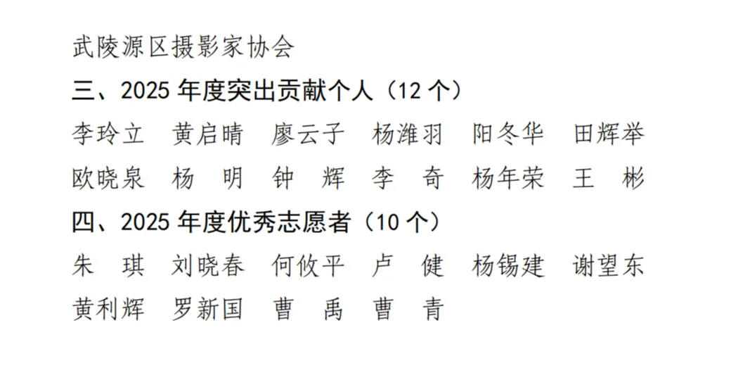 长沙市摄影家协会获“2025年度优秀团体会员单位”、会员李玲立、黄启晴、钟辉、杨年荣获“2025年度突出贡献个人”、办公室主任朱琪、会员谢望东获“2025年度优秀志愿者”,在此表示祝贺。