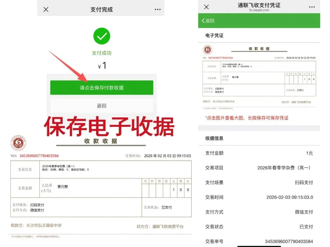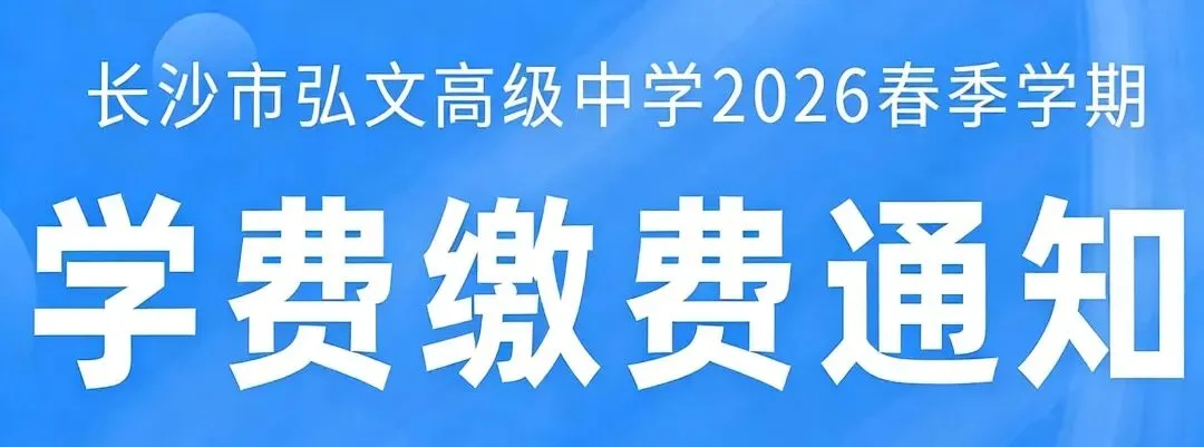 您好!新年的钟声即将敲响,在此,长沙市弘文高级中学向您致以最诚挚的问候。同时,为保障 2026 年春季学期每一位学生都能顺利入学,畅享优质教育资源,学校特别整理了详尽的缴费流程和注意事项,请您仔细阅读,并按时完成缴费工作。