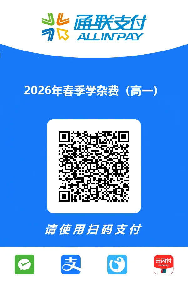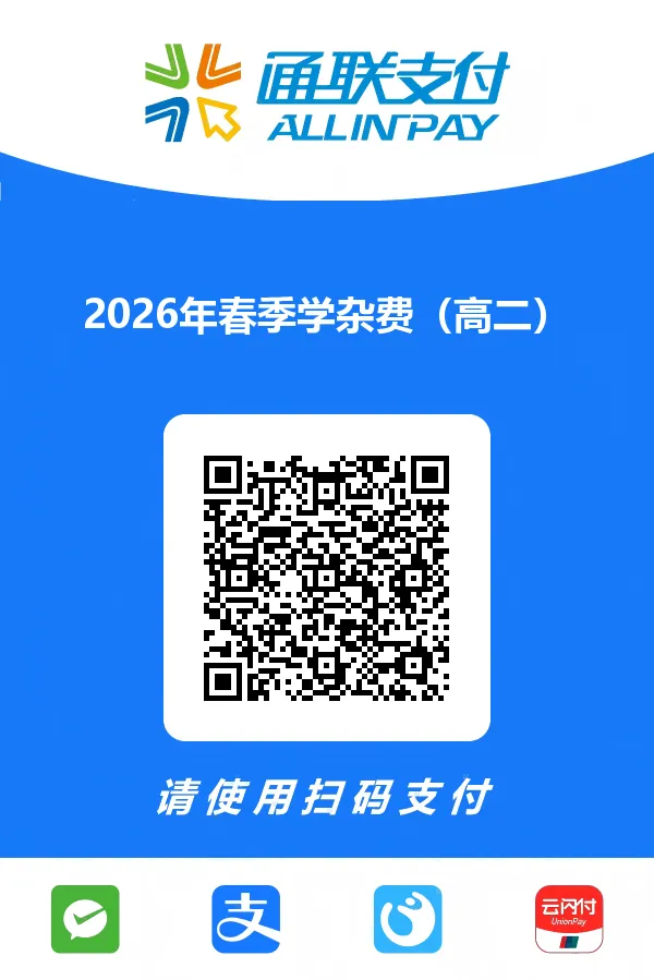 缴费渠道:本次新学期线上学费缴纳渠道为学校官方微信公众号,统一采用"通联飞收”平台缴费(这是唯一的缴费方式),微信和支付宝均可扫码支付。请各位家长务必通过指定渠道缴费,切勿通过其他途径操作。