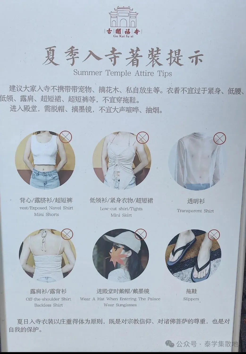 🙅🏻不可以❌穿暴露的衣服,比如超短裙超短裤,吊带背心,不要佩戴帽子,墨镜(详情请看图片)