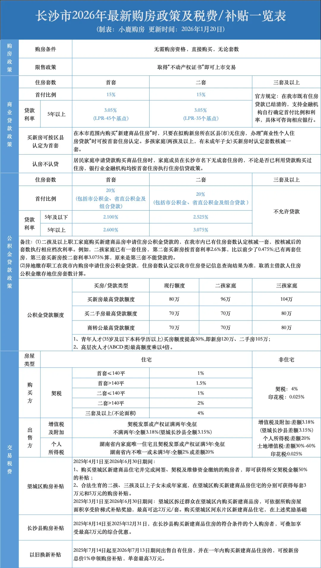 2026年长沙购房限购限售全面放宽,商贷、公积金首付及利率均达近年低点,博士、硕士、多孩家庭等可享专项补贴,另外望城区有契税补贴。