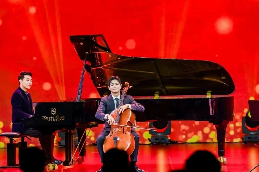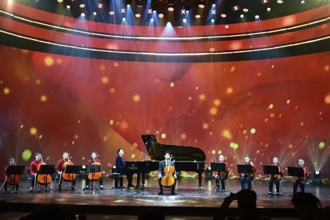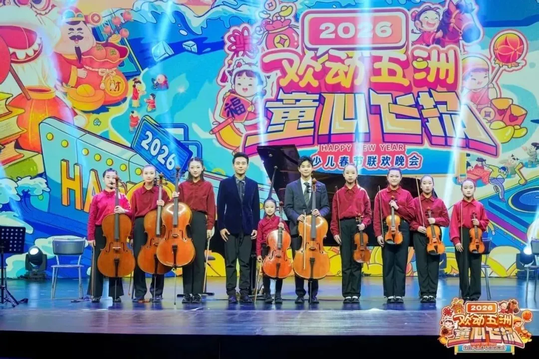 "欢动五洲·童心飞扬"全国少儿春晚是湖南卫视打造的知名品牌晚会,已成功举办了多届。本次演出采用纯器乐合奏形式,由国际钢琴演奏家汪洋、韩国籍大提琴演奏家赵宰亨组成的专业评审团,从长沙市青少年宫培训一部精心选拔出4名大提琴学员与4名小提琴学员。舞台上,汪洋老师担任钢琴演奏,赵宰亨老师领衔弦乐声部,与青少年宫学员默契配合,通过钢琴的磅礴铺陈、小提琴的昂扬婉转、大提琴的深沉诉说,让乐器间的对话交织成层次丰富的音响画卷,既保留了原曲对祖国山河与文化的深情礼赞,更以纯粹的音乐语言诠释了“音乐无界,情怀相通”的艺术主题。