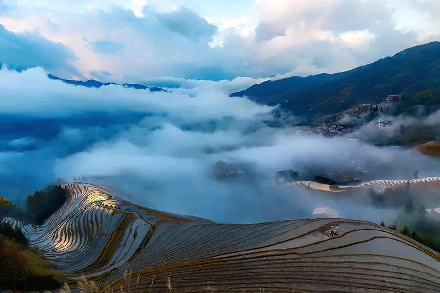 广西桂林龙脊梯田是世界梯田之冠,拥有 2300 多年农耕史,由壮族、瑶族先民依山开垦而成,梯田随四季变换呈现银链挂山间、金塔耀云端的震撼景象,森林 - 村寨 - 梯田 - 水系 “四素同构” 的生态智慧入选全球重要农业文化遗产,被誉为 “天人合一” 的大地艺术奇观。