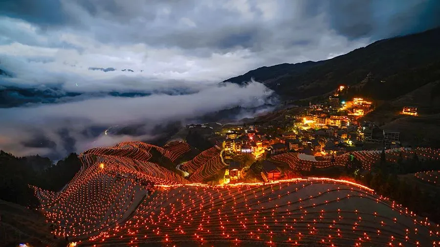 龙脊梯田的夜景堪称视觉与人文交织的梦幻盛宴,既有自然光影的浪漫,又有民俗风情的温度,氛围感拉满。