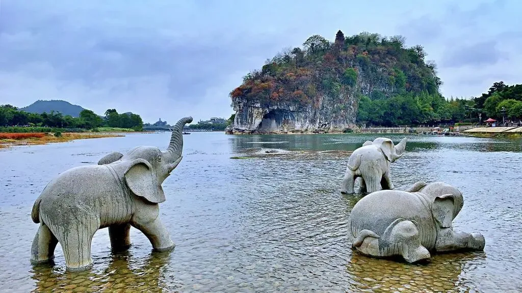 早餐后车队抵达桂林市区,先直奔象鼻山景区:站在漓江岸边望去,青灰色的山形如巨象汲水,江面倒影随波轻晃,晨雾未散时更像一幅水墨淡彩画,车友们随手拍都是 “城在景中” 的好片子。
