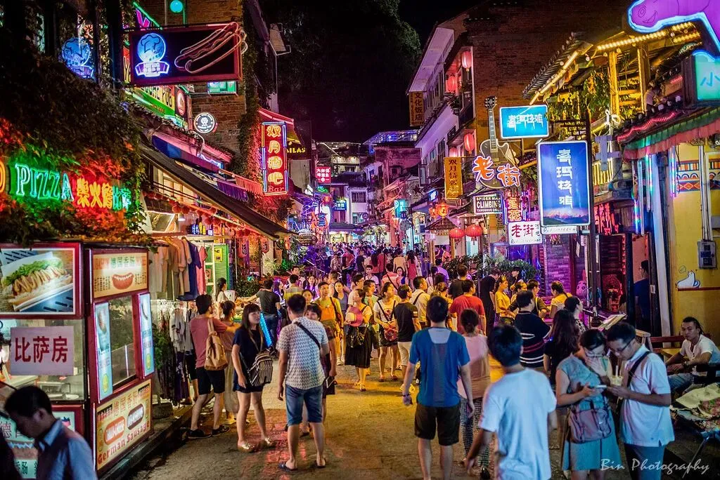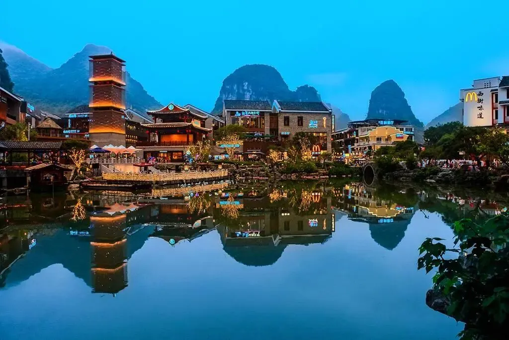 继续出发,路过兴坪时特意停下 —— 这里正是 20 元人民币背面的取景地:漓江水面泛着碧色,远处青山如黛,竹筏悠悠划过 “黄布倒影”,车友们拿着纸币对照实景拍照,连呼 “终于见到活的 20 块钱”。日暮时分,抵达阳朔西街,华灯初上时跟随领队寻一家外酥里嫩的啤酒鱼的口碑老店,鲜醇的酱汁裹着嫩滑鱼肉,配着西街的热闹人声,滋味十足。夜渐浓,推荐自行观赏《印象·刘三姐》,看漓江山水化作天然舞台,渔火、山歌、竹筏在光影里交织成梦,让这场阳朔之夜,美得格外难忘。