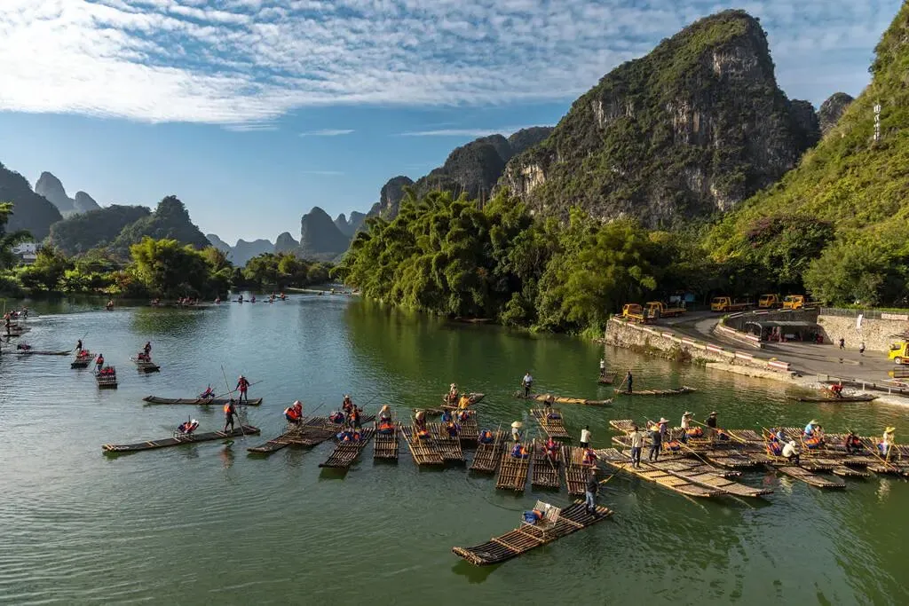 早餐后车队直奔遇龙河赴一场“人在画中游”的约会!随着撑筏师傅慢悠悠划过翡翠般的河面,两岸喀斯特峰林如水墨长卷徐徐展开,稻田、古村与凤尾竹相映成趣,几次冲坝的水花溅起清凉笑意,随手一拍都是自带滤镜的大片 。漂流途中静听水声潺潺,偶有山歌随风飘来,把阳朔十里画廊的灵秀与惬意尽数收入囊中。