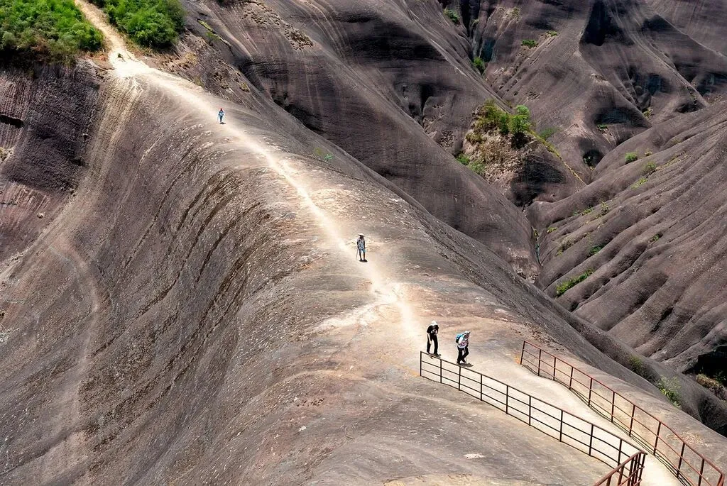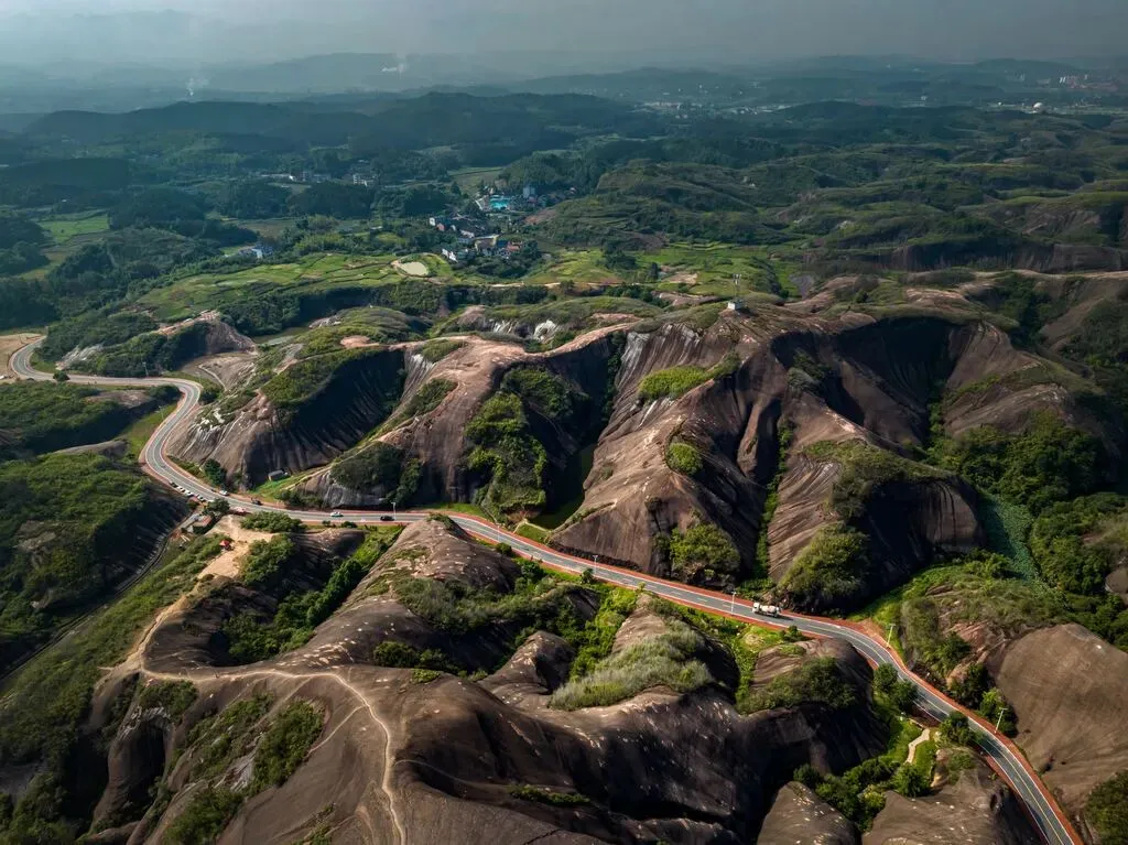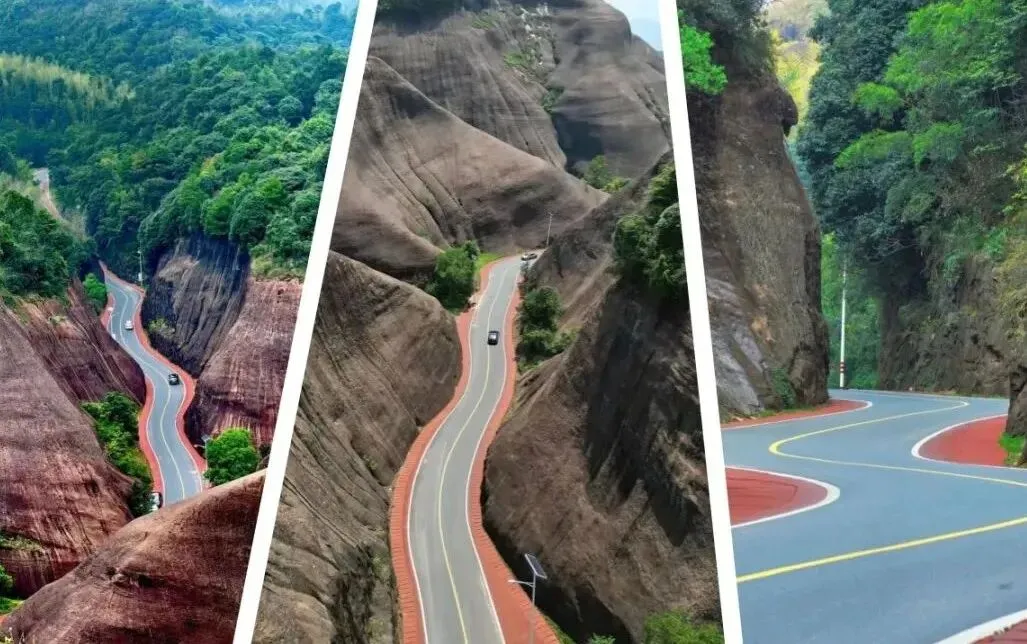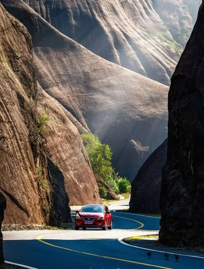 早餐后咱们驾车上路,奔赴马皇丘大峡谷开启丹霞奇遇。这里原称蚂蝗丘,如今赤色丹霞间的公路堪称自驾天堂,弯道错落着串联起赤壁与山谷,车行其间宛如在亿年地质画卷中穿行 。停下车徒步探访,鹅公寨、鹅婆寨的陡峭山径藏着野趣,U型弯道观景台能定格红岩与公路交织的震撼画面,偶遇的蜂巢洞穴、姻缘石等小景致,都值得驻足打卡。累了还能去附近乘竹筏悠悠荡过水面,让山风驱散自驾的些许疲惫。