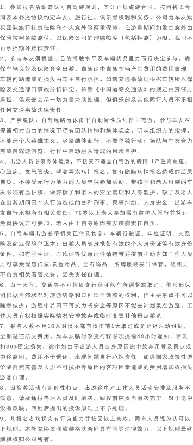 1、自驾活动领队车辆作为”1”号车,车队所有车辆必须服从活动领队统一指挥。2、所有车辆必须按车辆挡风玻璃上编号顺序依次行驶。在活动中没有印制粘帖带”4”的编号。4、根据车队安全需要,活动领队可能随时通知打开或关闭双闪灯,请您积极配合。 1、请您检查好你的车辆有无漏油、漏水、漏电、漏气现象。请您将燃油添加充足。2、请您带好身份证、驾驶证、行驶证、车辆购置附加税凭证、保险卡、车辆使用说明书、车辆维修保养手册等相关证件。 3、为便于参加此次自驾游活动车辆的识别,我俱乐部统一制作车贴及车辆顺序编号,请您主动配合我们俱乐部工作人员车贴粘贴工作。 4、为更进一步加强活动车辆安全管理,俱乐部将给每车配发一台对讲机,在对讲机发放时请您主动配合俱乐部工作人员的发放登记、对讲机使用讲解。 5.报名人数不足10人时俱乐部有权取消或者延迟活动组织,俱乐部会提前2天通知报名参与者。6.如有道路堵塞或者大雾、暴雨、暴雪、泥石流、地震等不可抗拒因素的情况,我自驾俱乐部有权变更路线或者取消行程,最终的解释权归自驾俱乐部所有。.1.请务必提前报名!本活动只接受现金缴费报名留房。全程无购物,除此基本无另外消费。领队会根据具体情况安排行程,确实不适合出游,没有发生的费用全退。2.行程仅供参考,领队保留根据自然状况对旅游线路和日程适当调整的权利。3.关于拼车: 需要拼车的请提前报名,统一协调安排。建议拼车费费用给车主,实际拼车费可也以和车主协商aa决定。路上出现交通事故按交警处理意见处理,原则上驾驶员无过失拼车者不得就交通事故造成的损失向车主索赔。4.注意安全,路上交通安全自行负责,自由活动时间出现安全问题自己负责,俱乐部不负担任何连带责任。5.原始路线,考虑到自驾途中有不确定性,领队有权根据各景区人流量及交通状况进行适当调整行程,望车友予以支持配合,在保持游览景区不变的情况下特别对行程及行车路线进行了优化调整,以便更有利于游览!祝自驾一路顺风,开心出游,安全回家!6.关于吃住标准:全程高标准,个别地区住宿吃饭条件可能较差,尽管组织者已尽力而为,也不能保证达到要求条件,太计较者请勿报名。更多计划陆续推出,请持续关注...