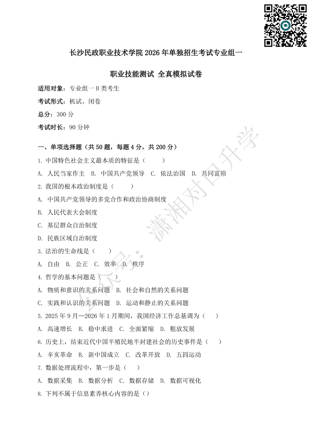 湖南信息职业技术学院2025年单招考试职业技能测试D组试卷(应届普通高中毕业考生、退役军人)