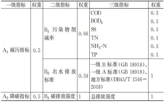 目前国内开展城镇污水处理厂减污降碳效能量化分析的应用研究较少,为进一步量化评估洋湖再生水厂厂站减污降碳效能,采用团体标准《废水处理减污降碳协同评估指南》(T/ACEF 144-2024)中综合评估方法和污水处理厂评估指标体系,相关指标设置及污染物权重如表2、表3所示。