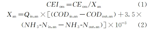 式中CEIom——污水厂厂站运维阶段年污染物削减碳排放强度,kgCO2-eq/kg;