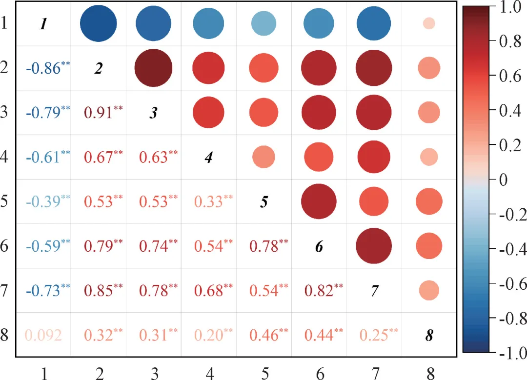 注:1污染物削减碳排放强度;2进水COD;3进水BOD5;4进水SS;5进水HN3-N;6进水TN;7进水TP;8吨水电耗,**P≤0.01。