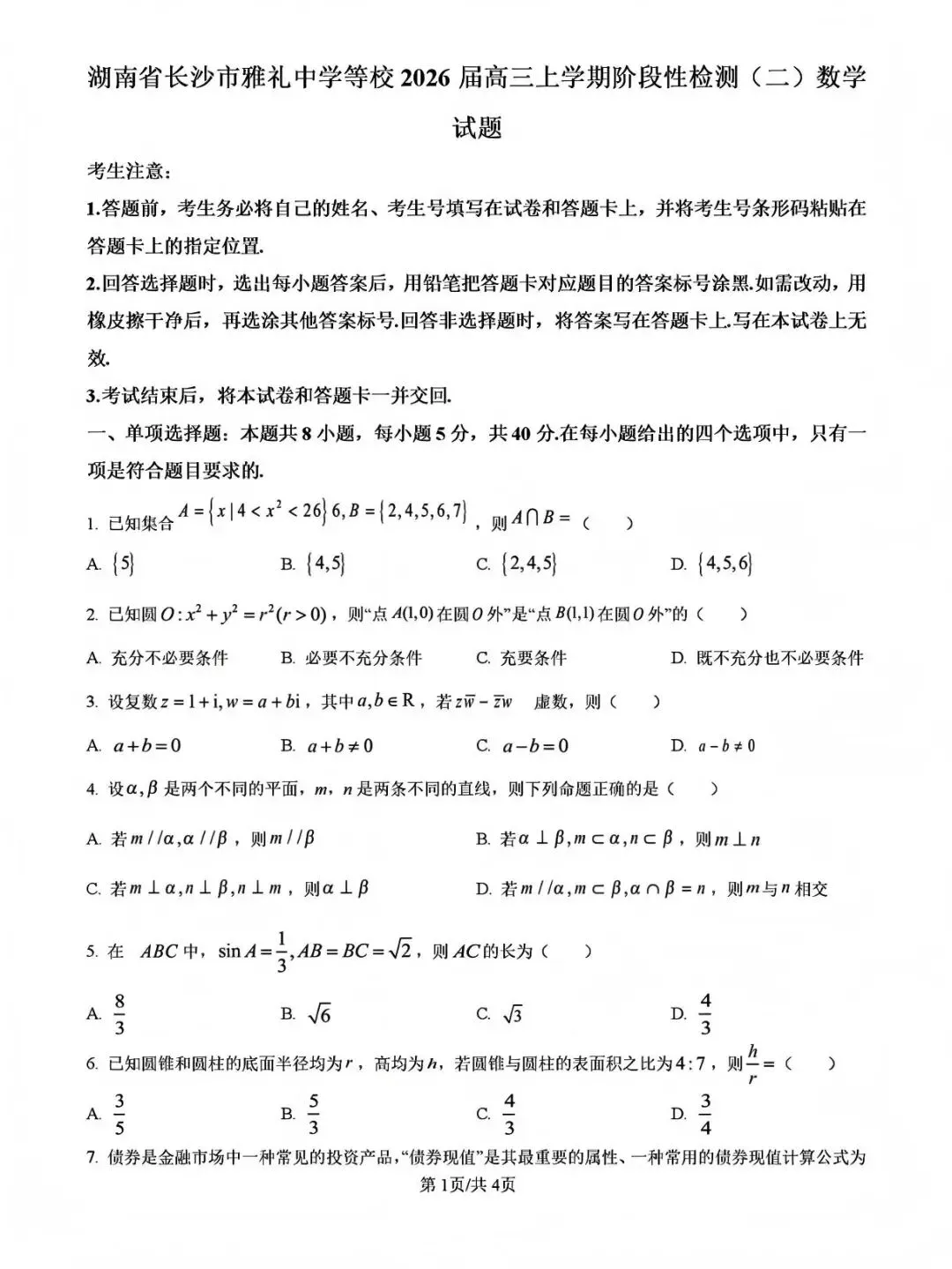 >湖南省长沙市雅礼中学2026届高三上学期阶段性检测二(原卷)
