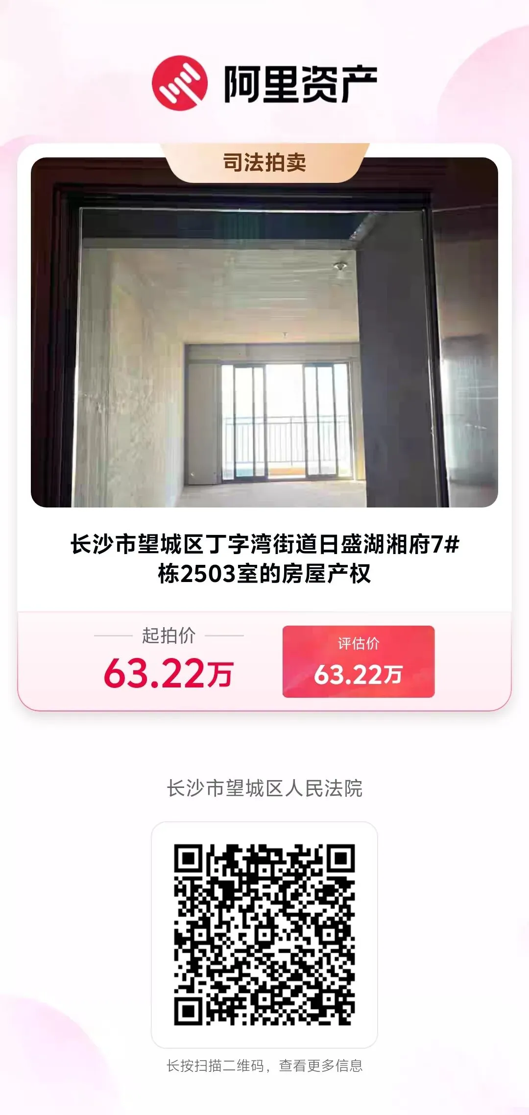 长沙市望城区丁字湾街道日盛湖湘府7#栋2503室的房屋产权将于2026年3月15日10:00时至2026年3月16日10:00时(延时的除外)在长沙市望城区人民法院淘宝网司法拍卖网络平台上(http://sf.taobao.com/0731/09,户名:长沙市望城区人民法院)公开进行第一次拍卖活动。