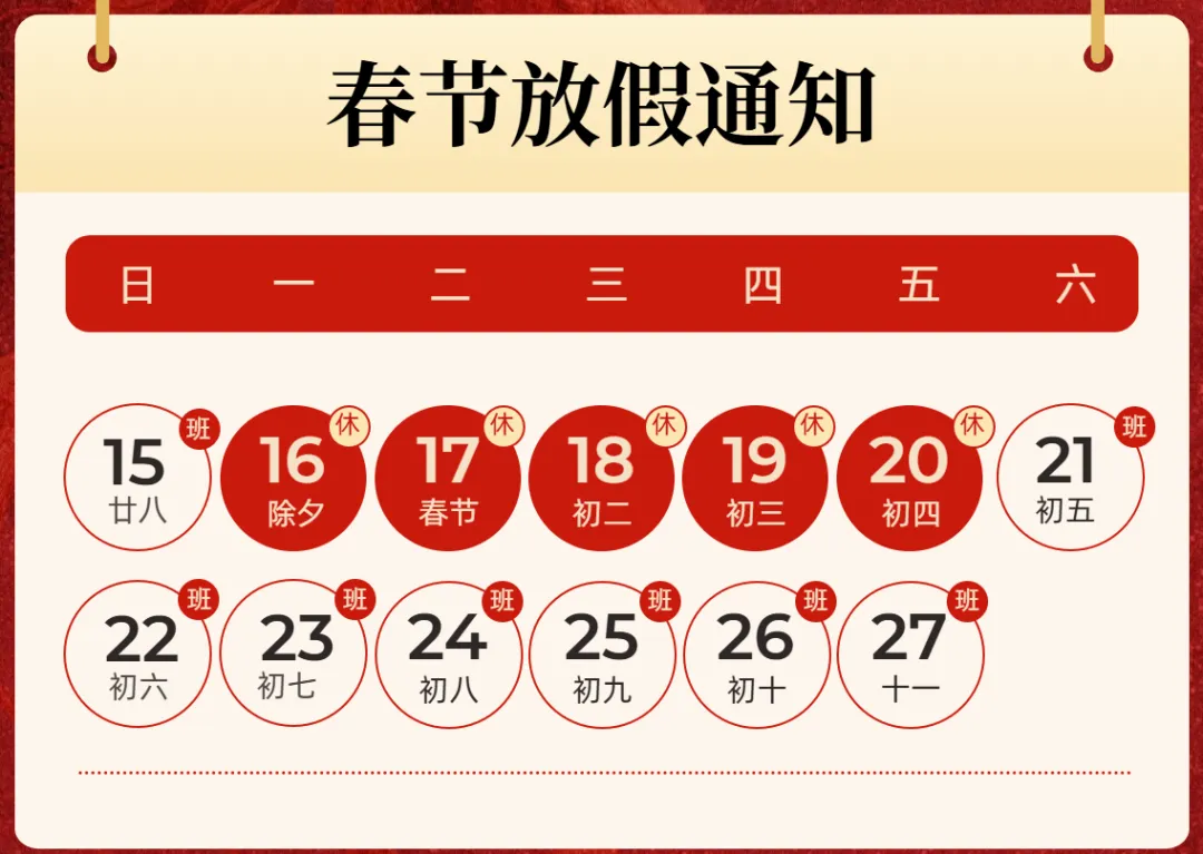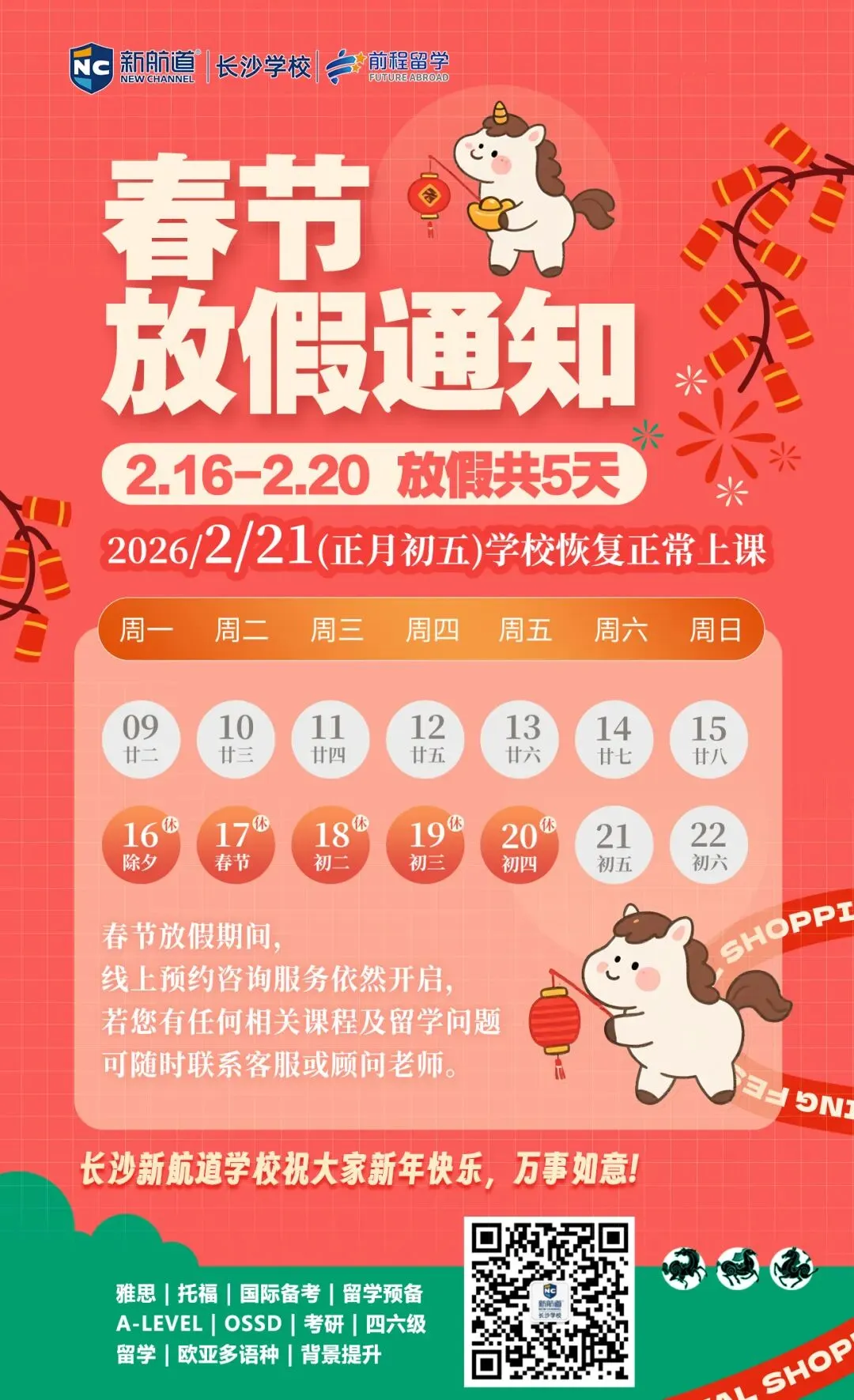 金蛇辞旧岁,骏马踏春来!为了喜迎传统的新春佳节,合理安排各项工作计划,结合我校实际情况,在2026年更好服务各位家长和同学,经校领导研究决定,我校2026年春节放假安排如下: