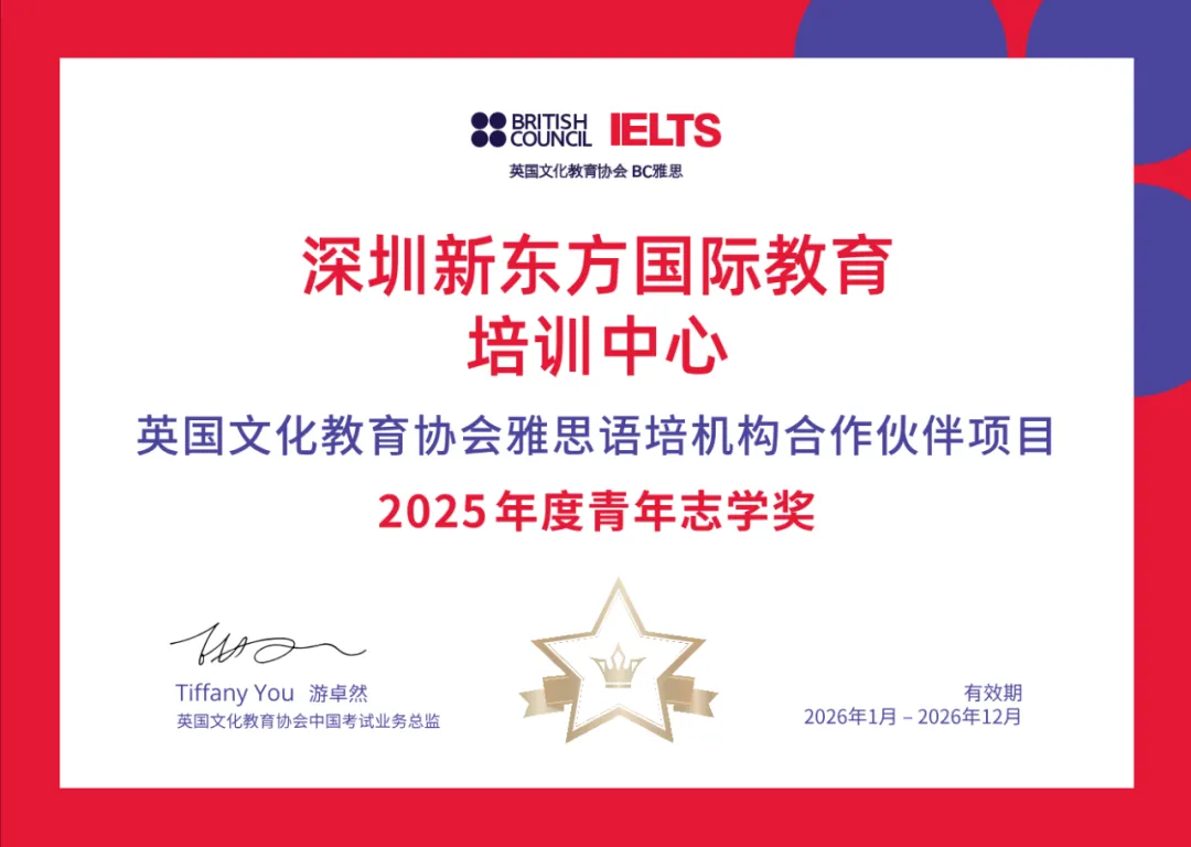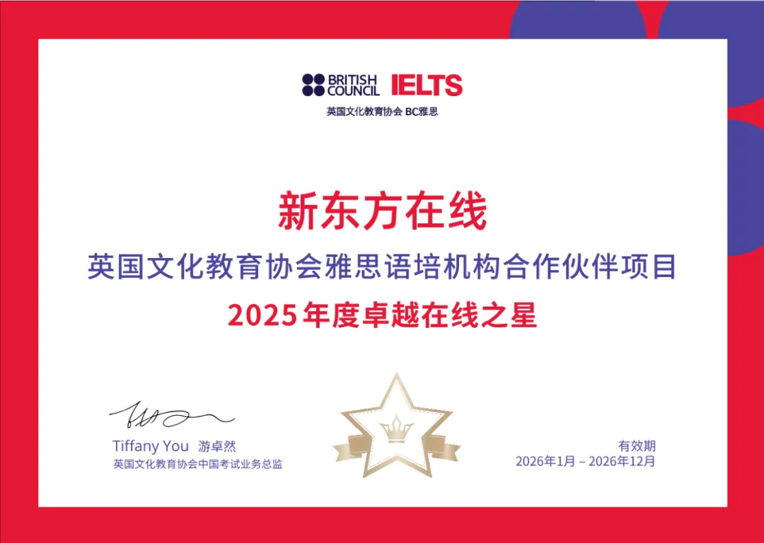 因新东方国际教育在2025年雅思考生培训中做出的杰出贡献,雅思官方在本年度向新东方国际教育颁发了“集团贡献奖”。