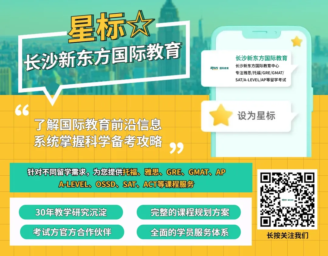针对不同需求,长沙新东方国际教育提供多种有针对性的课程服务,包括雅思、托福、GRE、GMAT、AP、A-Level、OSSD、SAT、ACT等。