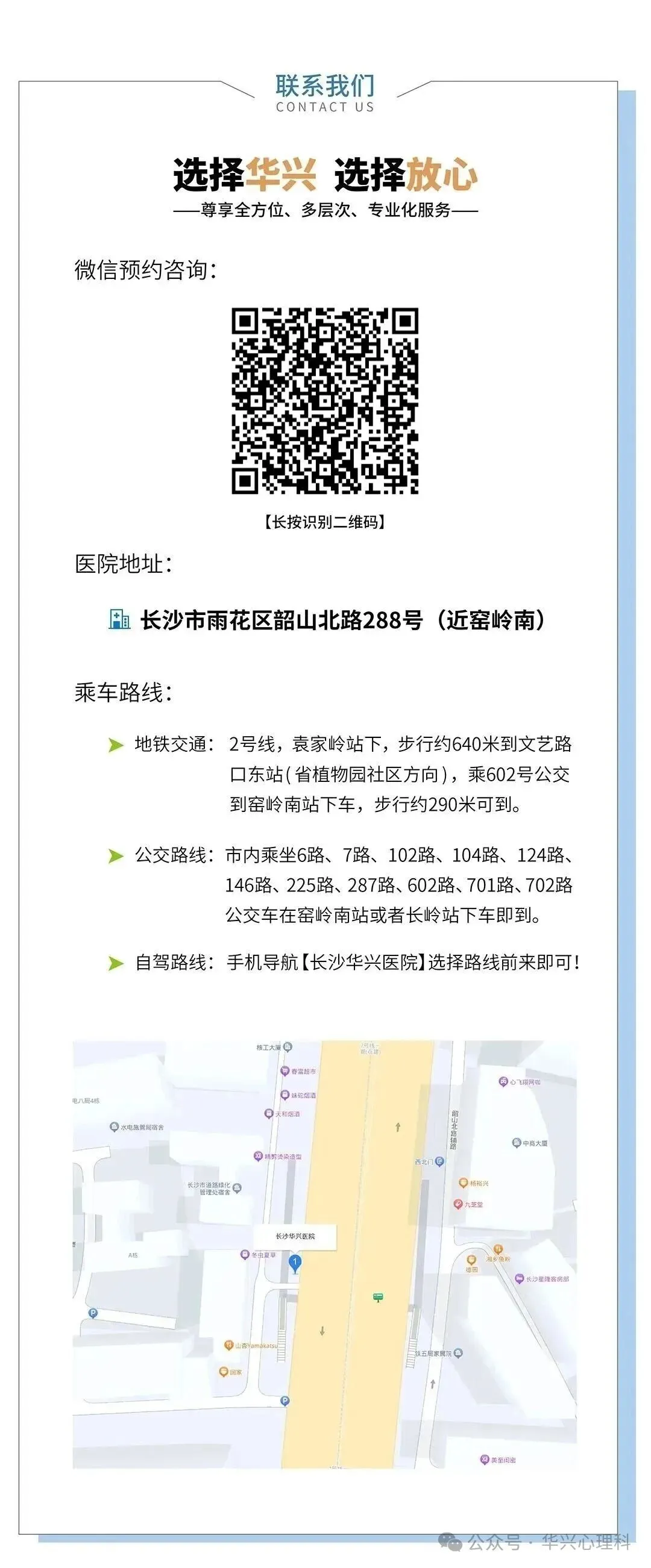 长沙华兴医院是湖南省长沙市雨花区的定点医疗机构,坐落于韶山北路288号,集医疗、康复、健康管理于一体,专注精神心理疾病诊疗。  医院主流科室汇聚多名骨干专家及特邀医师,并配备二级心理咨询师,组建专业医疗团队。团队在失眠、抑郁、焦虑、强迫症,以及精神障碍、神经障碍、青少年心理问题、精神分裂症等各类精神心理疾病领域,拥有多年临床诊疗经验,可为患者提供针对性诊疗与康复服务。