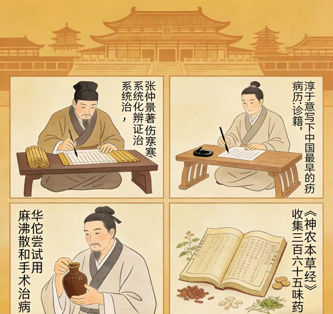《伤寒杂病论》不是凭空出现的,它是汉帝国四百年医学实践的压卷之作。在此之前,医学是散落的珍珠;在此之后,它被串成一条完整的链。张仲景没有发明辨证论治,他做了一件更伟大的事:把它系统化。六经辨证,脏腑辨病,理法方药,一脉贯通。这不是一本教人治病的书,而是一套教人如何思考疾病的方法论。从此,中国医学有了语法。