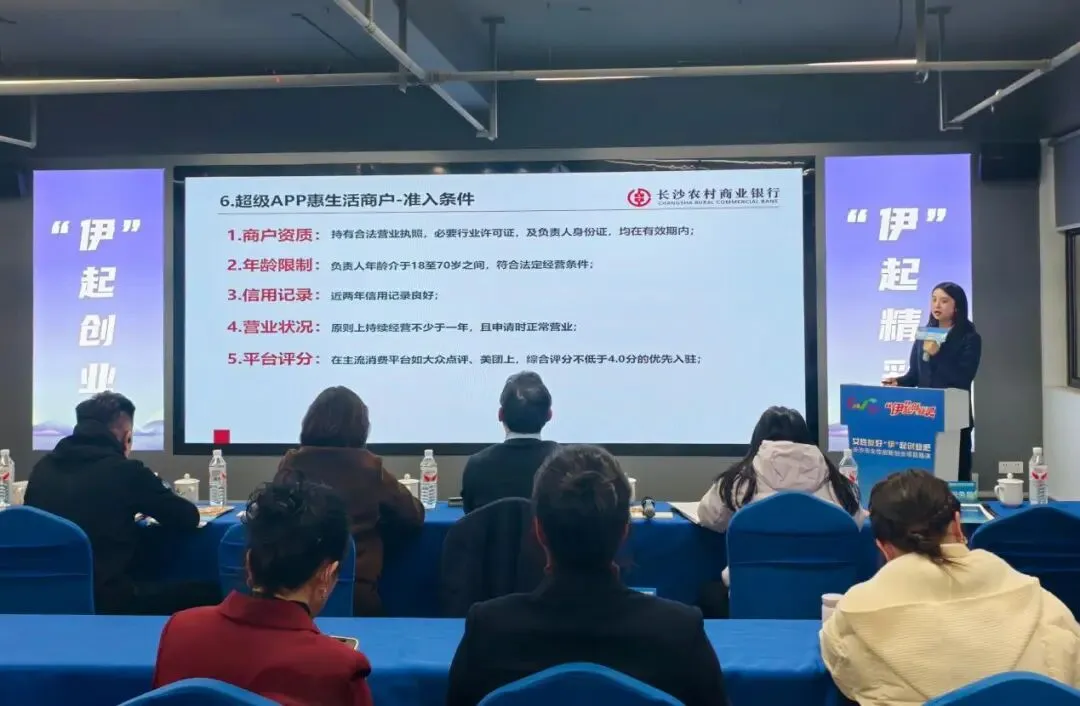 随后,岳麓支行作为金融机构代表介绍了长沙农商银行的发展概况,并对我行金融产品进行专题宣讲。结合现场大学生、女性创业者的实际需求,分别从对公条线、零售条线推介了多款我行特色金融产品,先后就“税易贷”“小微企业线上流水贷” “小微企业福祥便民卡”“科技型企业知识价值信用贷款”“长沙市人才、大学生创业担保贷款”,从产品简介、适用客户、产品特点等方面进行了详细介绍。结合创业项目中的企业门店经营需求,支行重点介绍了我行超级APP惠生活板块,从“平台是什么”“入驻有什么”“入驻给什么”“如何入驻”等维度进行了全方位介绍,吸引了一批创业者的关注。