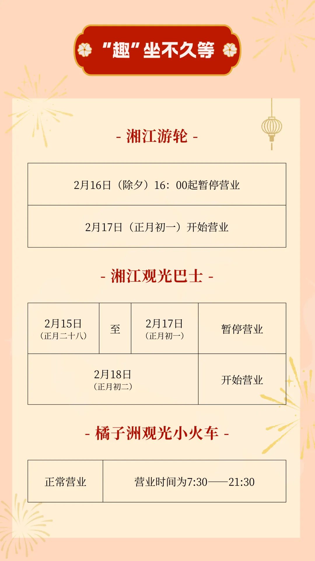 各类观光设施运营时间也有所调整。湘江游轮将于2月16日(除夕)16:00起暂停营业,2月17日(正月初一)恢复营业;湘江观光巴士将于2月15日(腊月二十八)至2月17日(正月初一)暂停营业,2月18日(正月初二)恢复营业;橘子洲观光小火车春节期间保持正常营业。