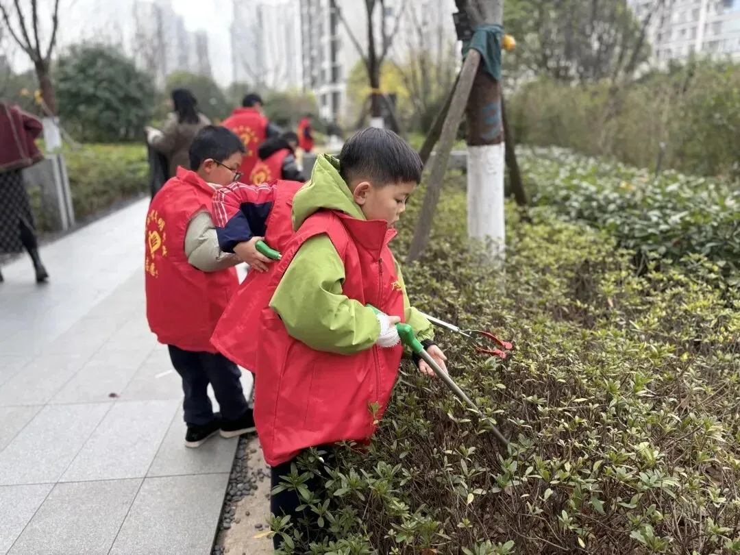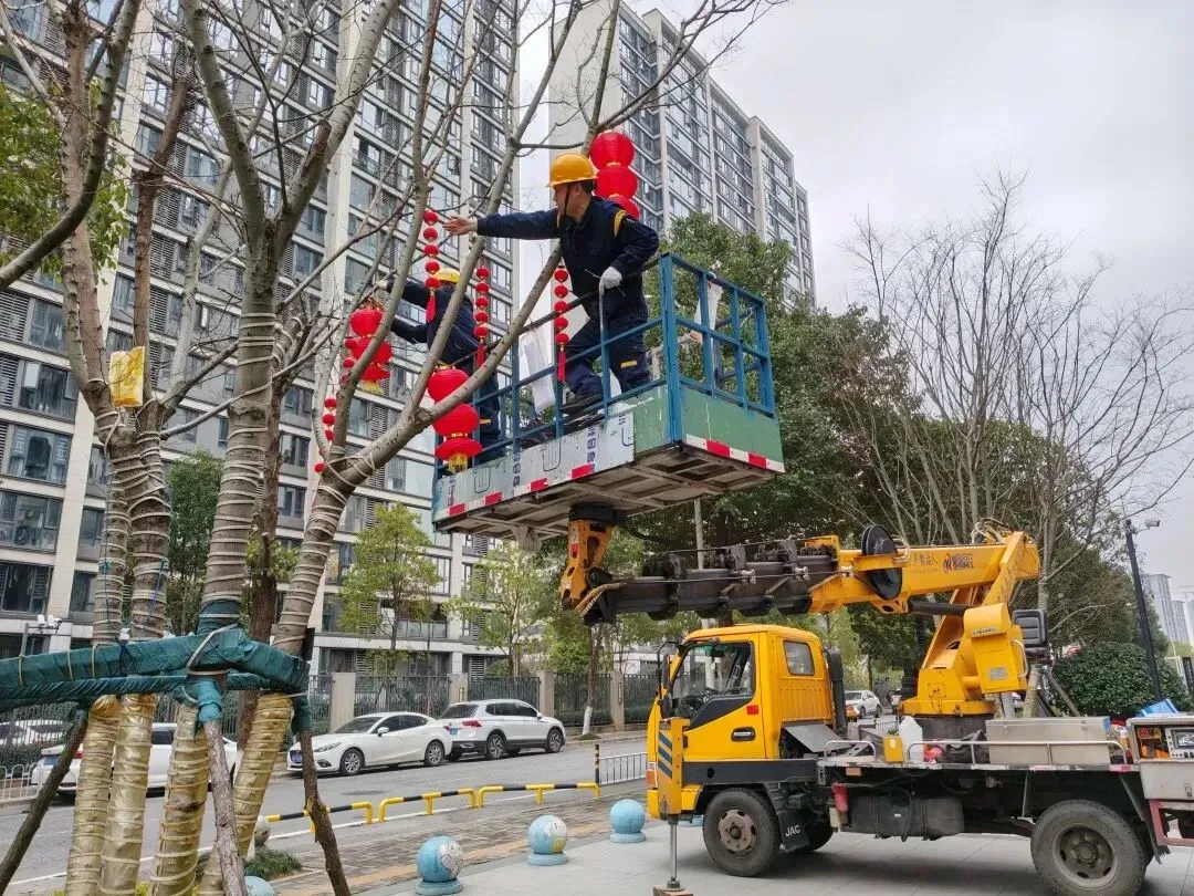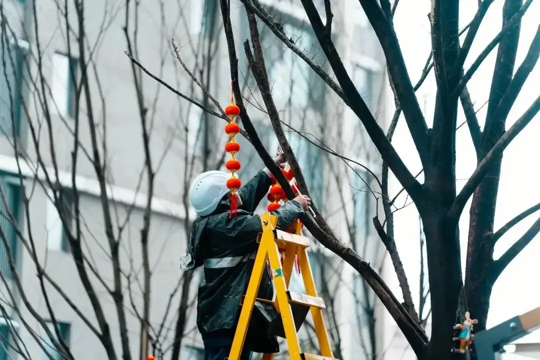 绿化师傅手持剪刀,为园区里的每一株绿植“理发塑形”——修剪枯枝、补种新苗、施肥养护,让四季常青的绿意与新春的红火相映成趣。