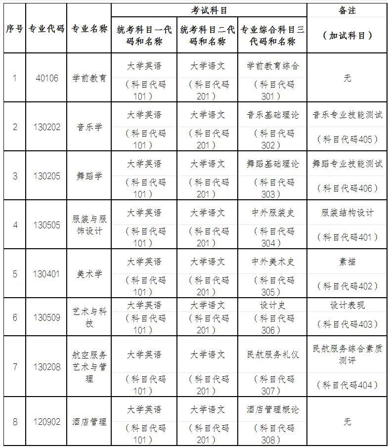 新增:音乐学、舞蹈学、美术学、艺术与科技、航空服务艺术与管理、酒店管理