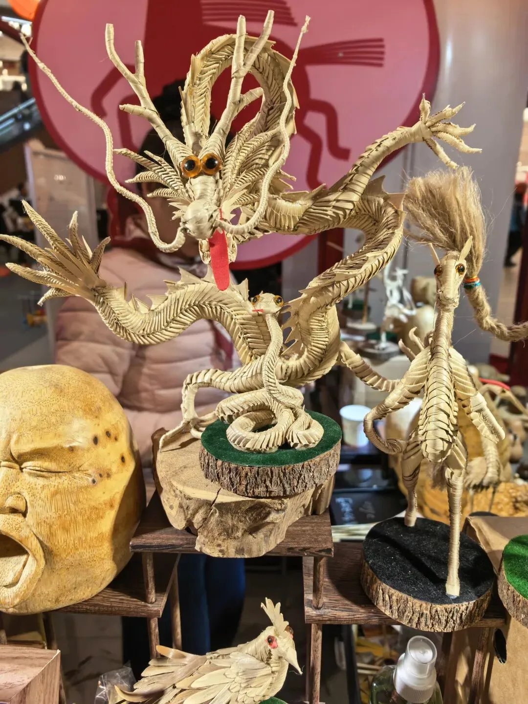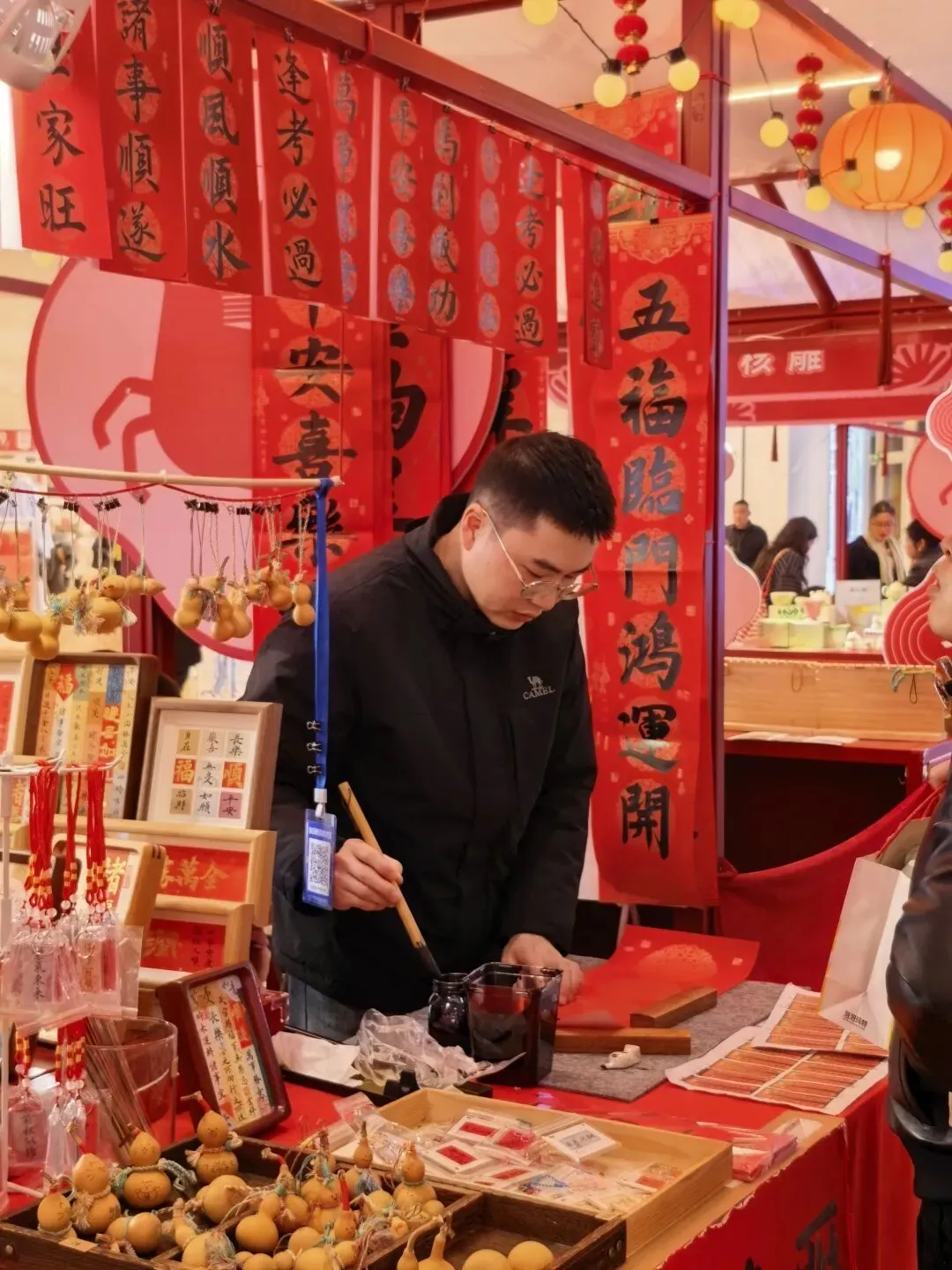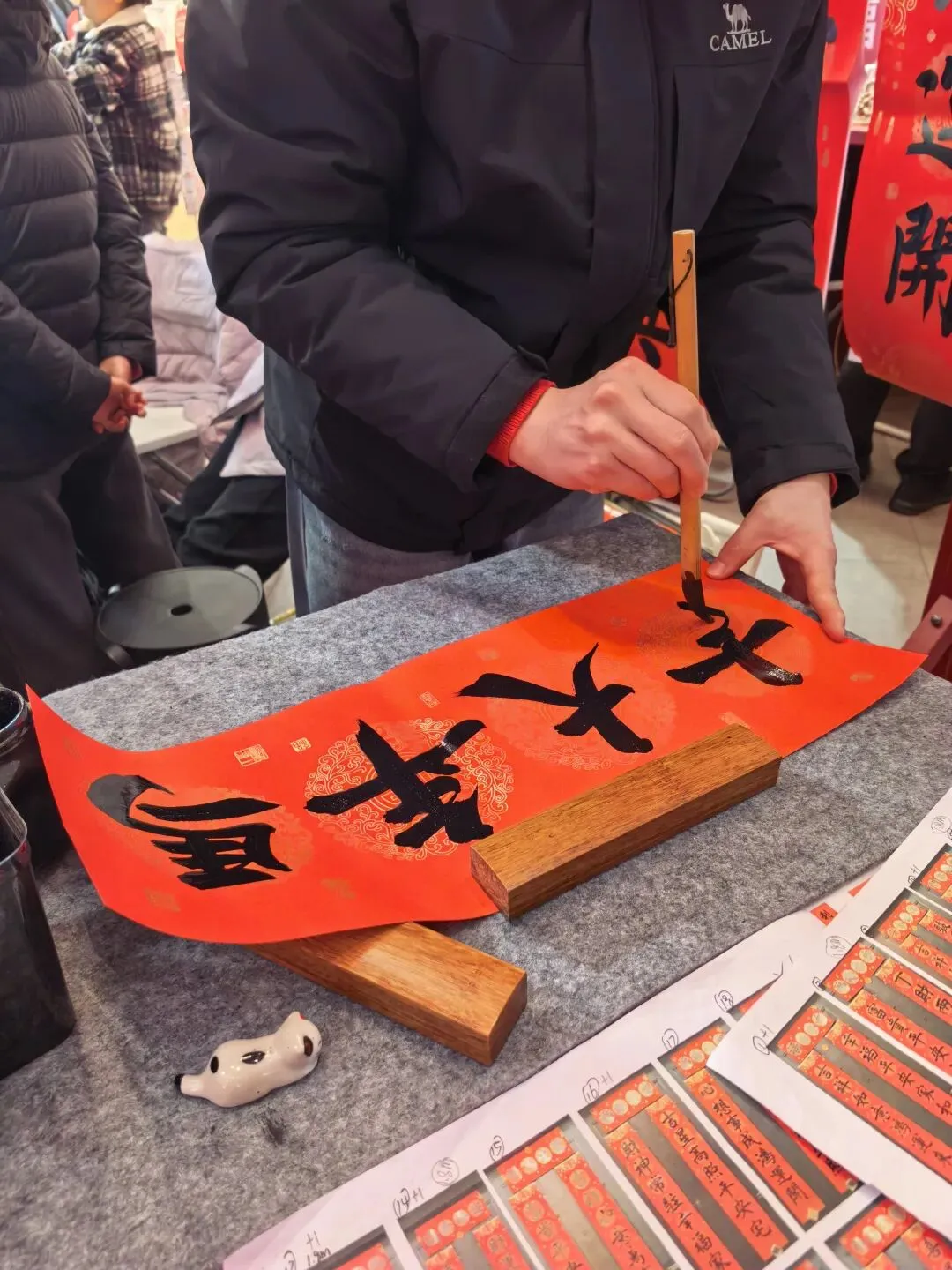 新年集市也开张了,写对联、石膏板拓印、泥塑“马上发财”、栩栩如生的草编,新年礼物派起来。