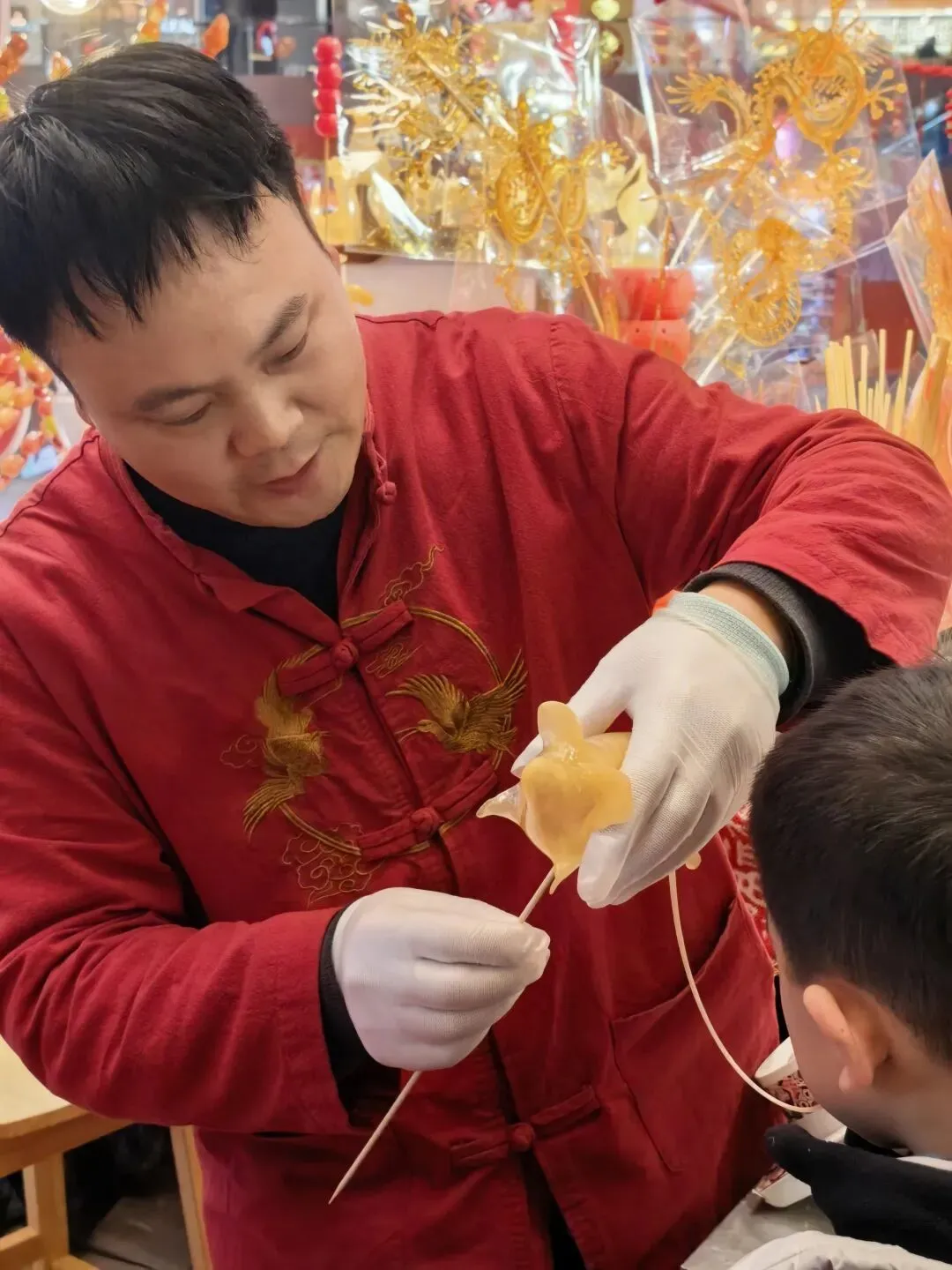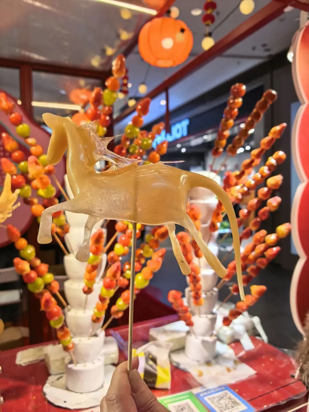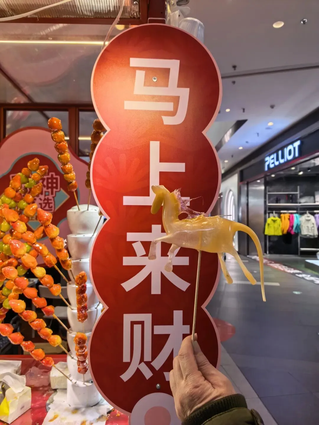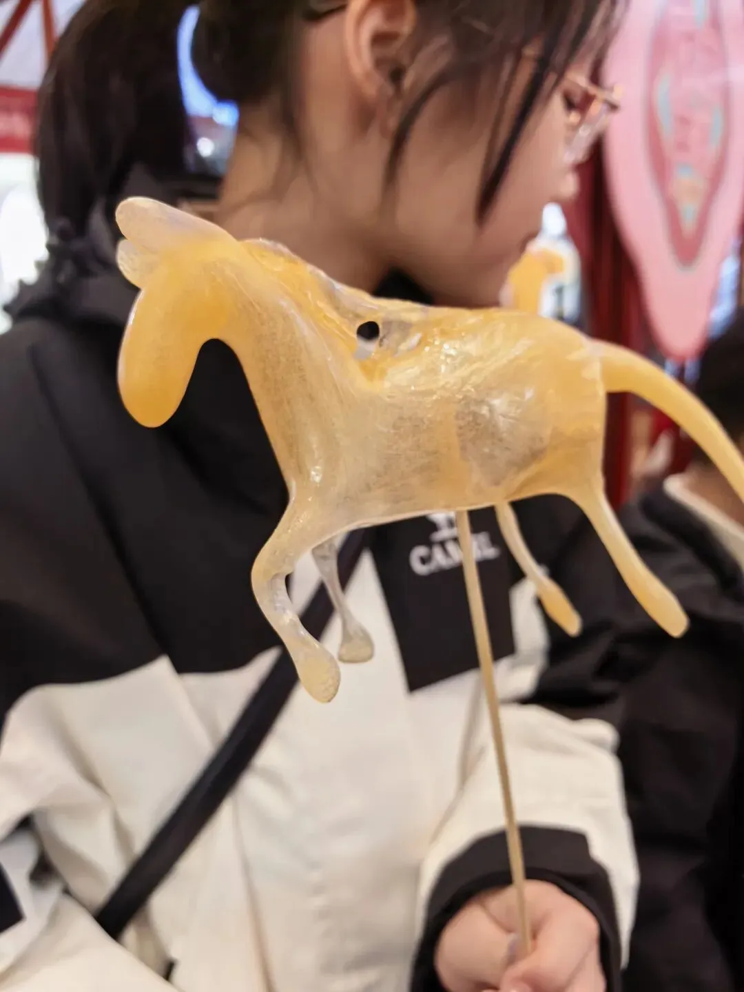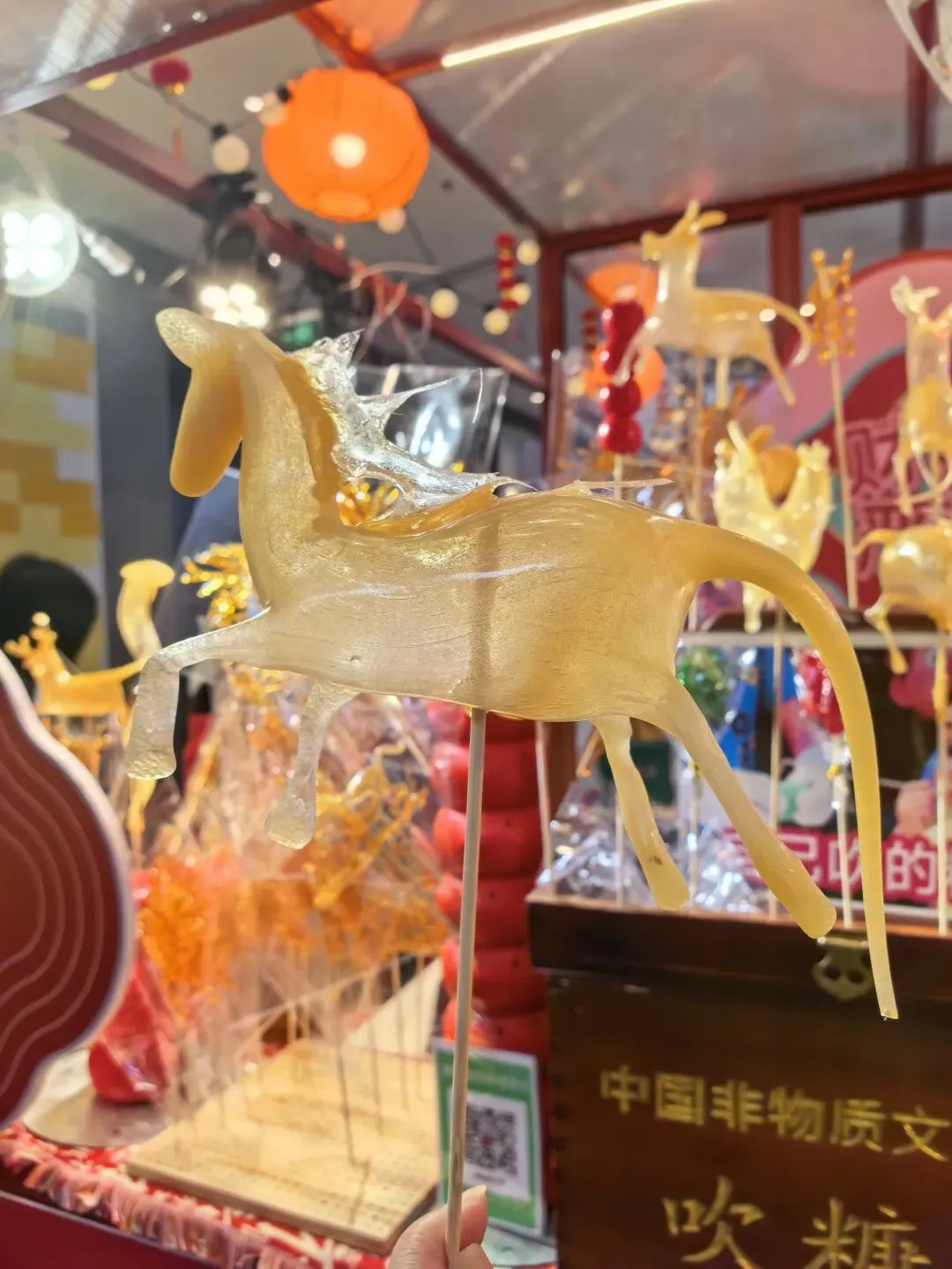 最有意思的集市店铺是吹糖人。店主的手艺不是盖的,小猪、葫芦、小狗、马儿都吹得生动、形象。我也凑热闹吹了一匹马儿,祝愿新的一年“马上来财”。