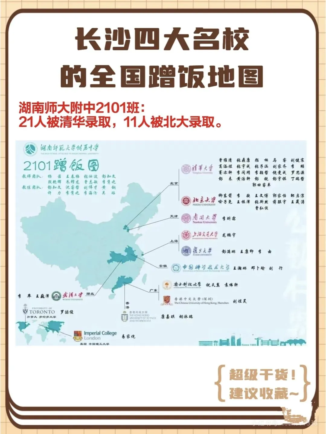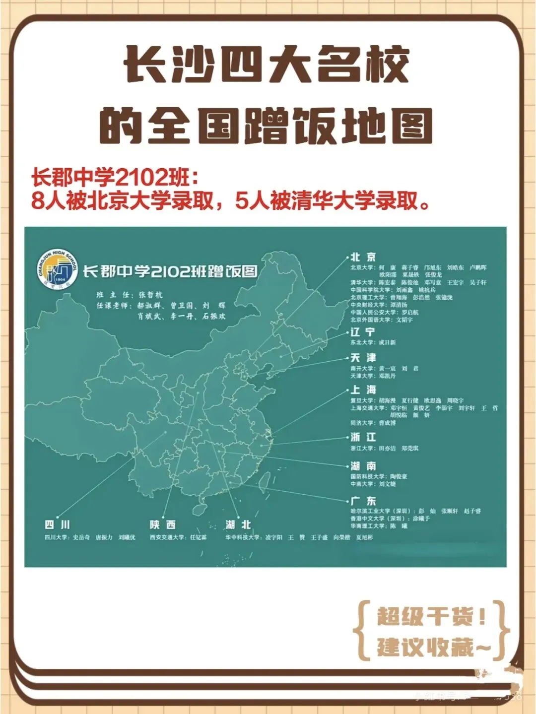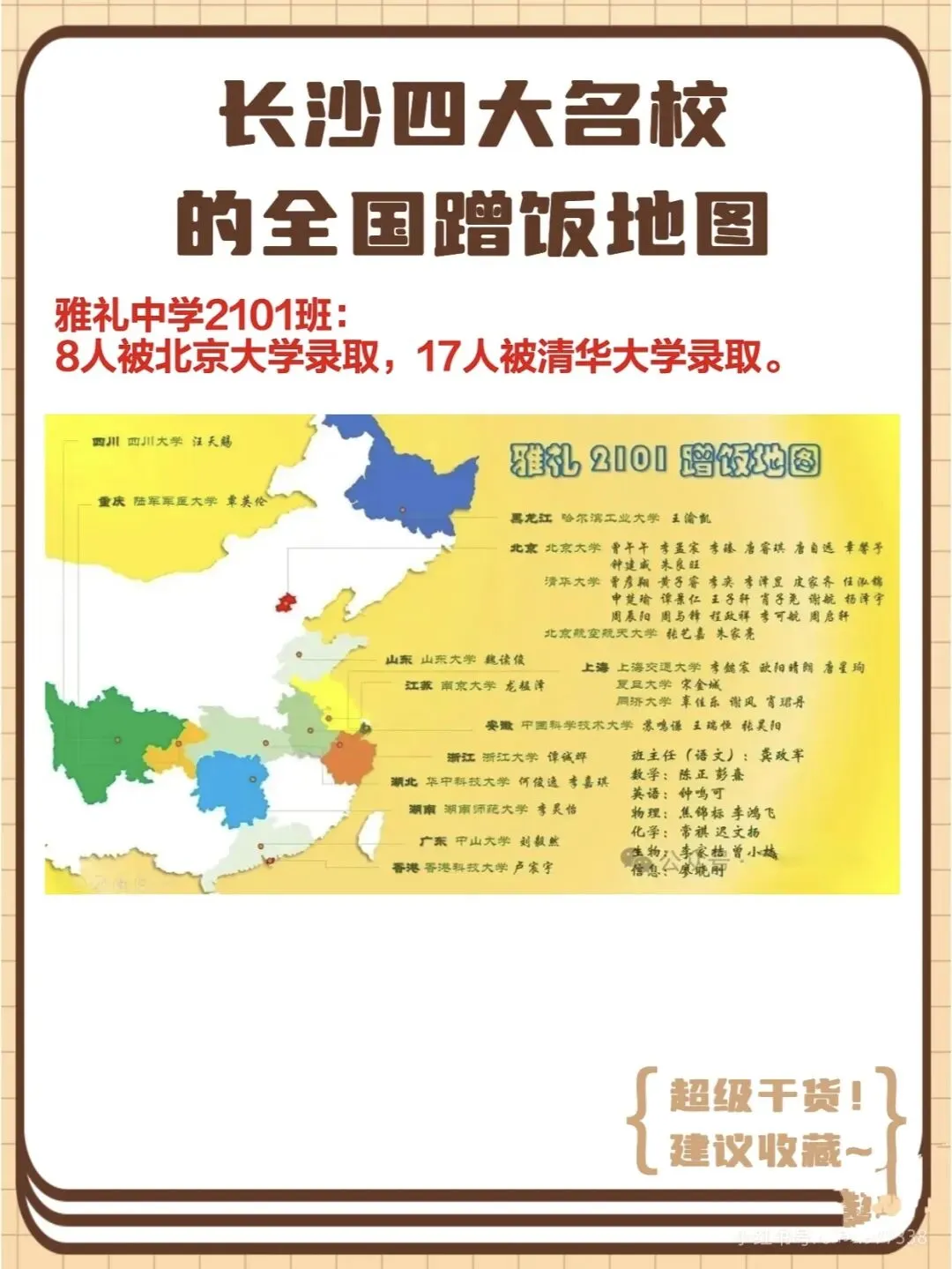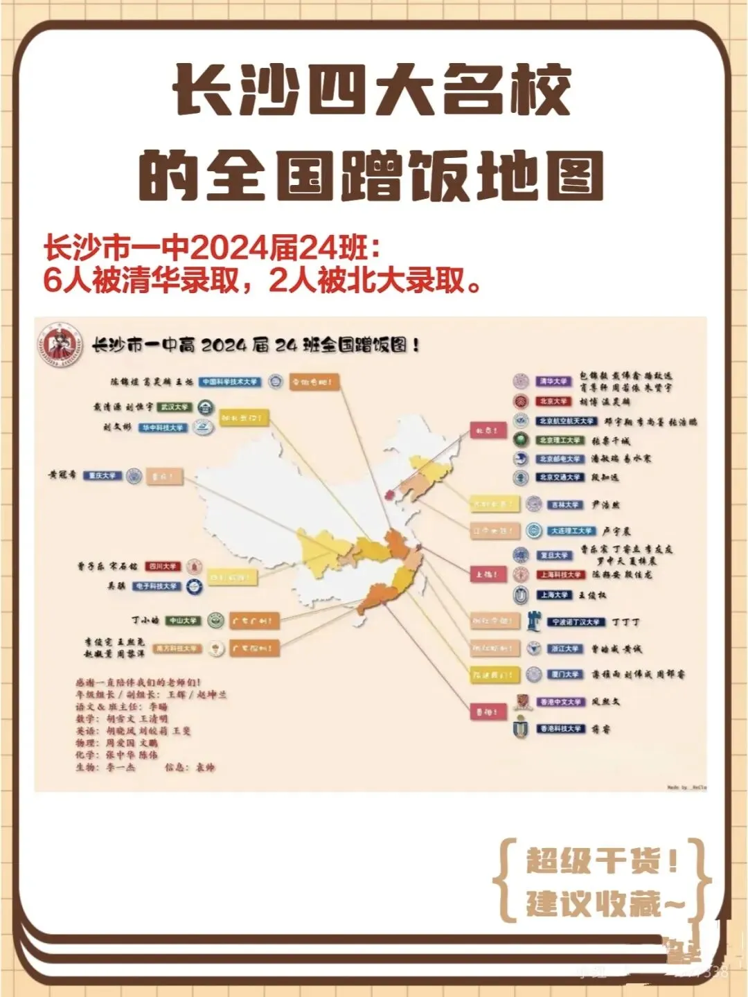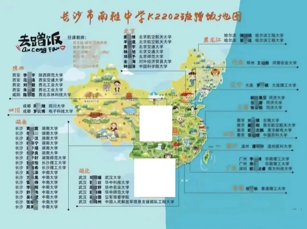 就拿四小之一的南雅中学K2202班(重点班)来说,2025年高考,全班50多名学生,60%以上都考入了985大学!从西安交通大学、同济大学、武汉大学等中上游985,到中南大学、湖南大学等本地985,再到香港理工大学、中国科学院大学这类特色院校,都是这个班学生的升学去向,一张“蹭饭地图”,看遍全国名校。