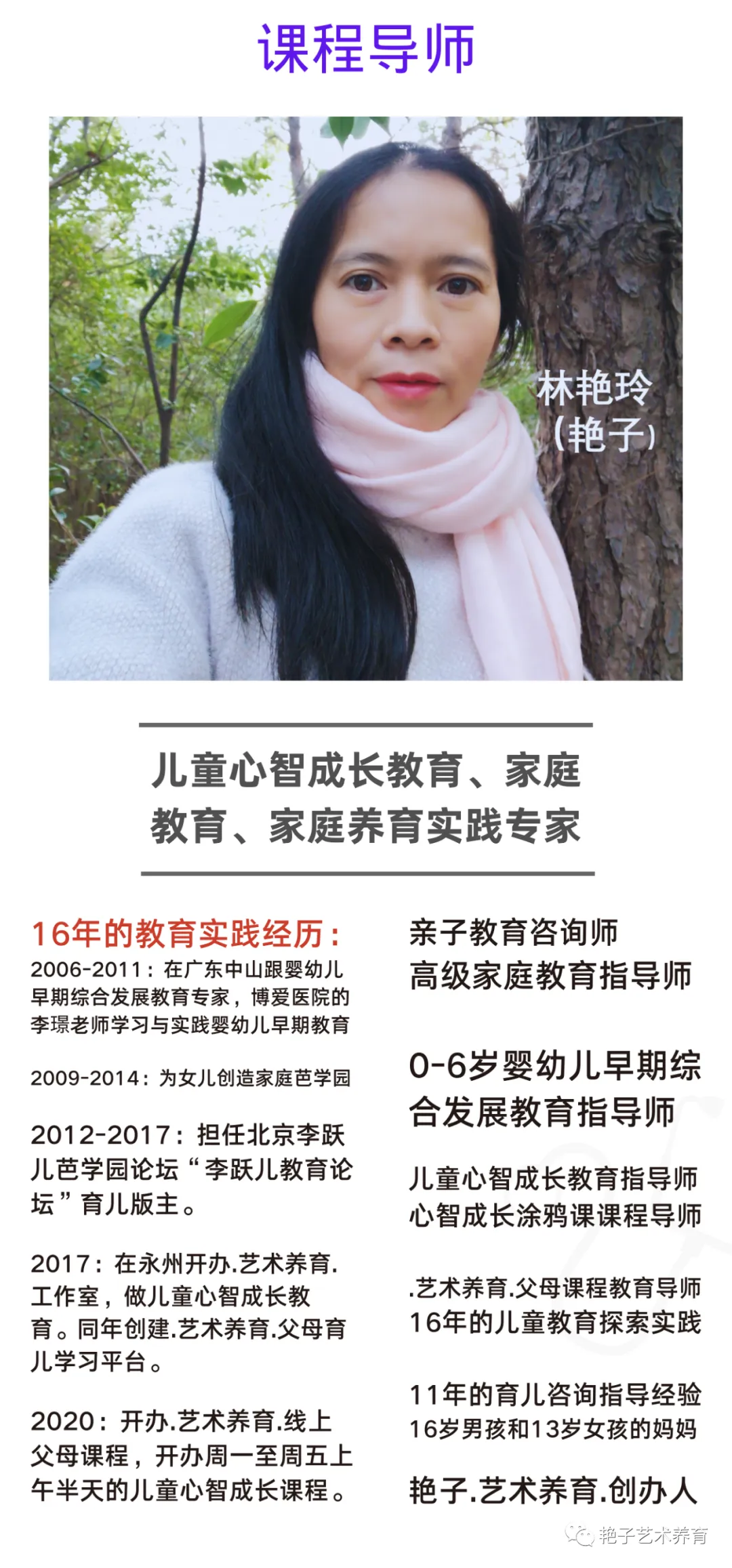 开办艺术养育工作室与创建育儿学习平台:开办艳子【艺术养育】工作室,做儿童心智发展成长与心理思维素养教育。同年创建艳子【艺术养育】父母育儿学习平台(微信群),传播适合孩子发展的建构主义教育,给家长们在平台分享科学育儿的教育和育儿指导答疑。