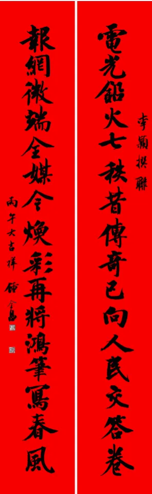 解读:这副题写长沙晚报的获奖联,以凝练的语言道出长沙晚报的七秩峥嵘与全媒体的时代特征,展现了主流媒体守正创新、为新时代擂鼓发声的鲜明特点。全联通过“电光铅火”与“报网微端”的意象铺陈表达了传统报业向全媒体的完美转型,又以“答卷”“春风”的隐喻,彰显了作为党媒始终如一的为民情怀。