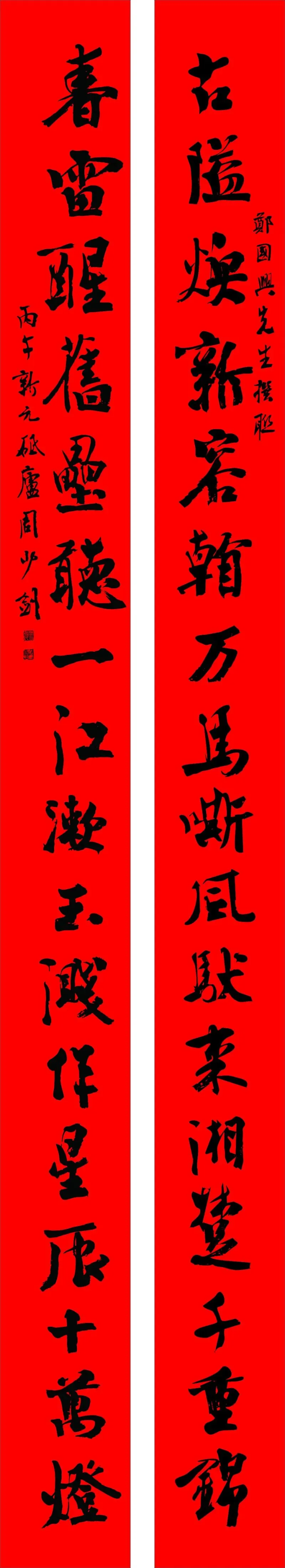 解读:上联精准概括了浏阳门从古代军事堡垒到现代城市景观的蜕变过程。下联蕴含新年新气象,一幅国家安宁,人民康泰的美好蓝图。其中“焕”字既指城楼建筑外观的修缮更新,更喻指湖湘文化记忆的动态传承,凸显更新力度;“醒”字既指春天万物苏醒,亦指文化、思想、精神的觉悟觉醒,彰显传承效果;“驮”字承接上句“万马嘶风”,强化历史承载;“溅”字强调长沙作为“星城”的地域特色动态呈现。