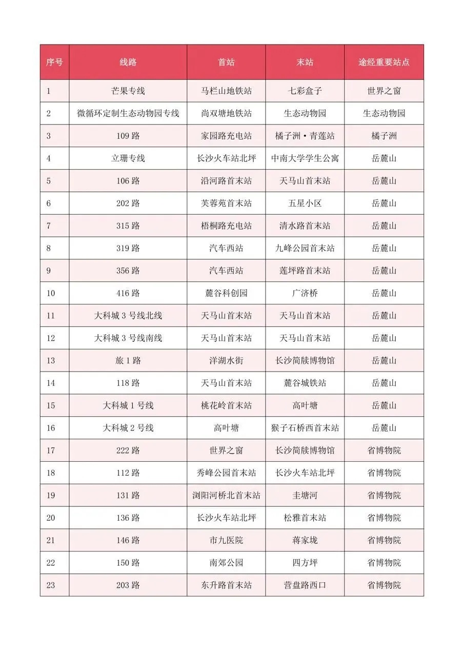 从2月15日(腊月廿八)至2月23日(正月初七),这72条公交线路实行免费乘坐。这里面包括“景区直通车”:有53条线路精准覆盖生态动物园、世界之窗、岳麓山、橘子洲、省博物馆、开福寺、潮宗街、天心阁、大王山等全市重点景区景点。