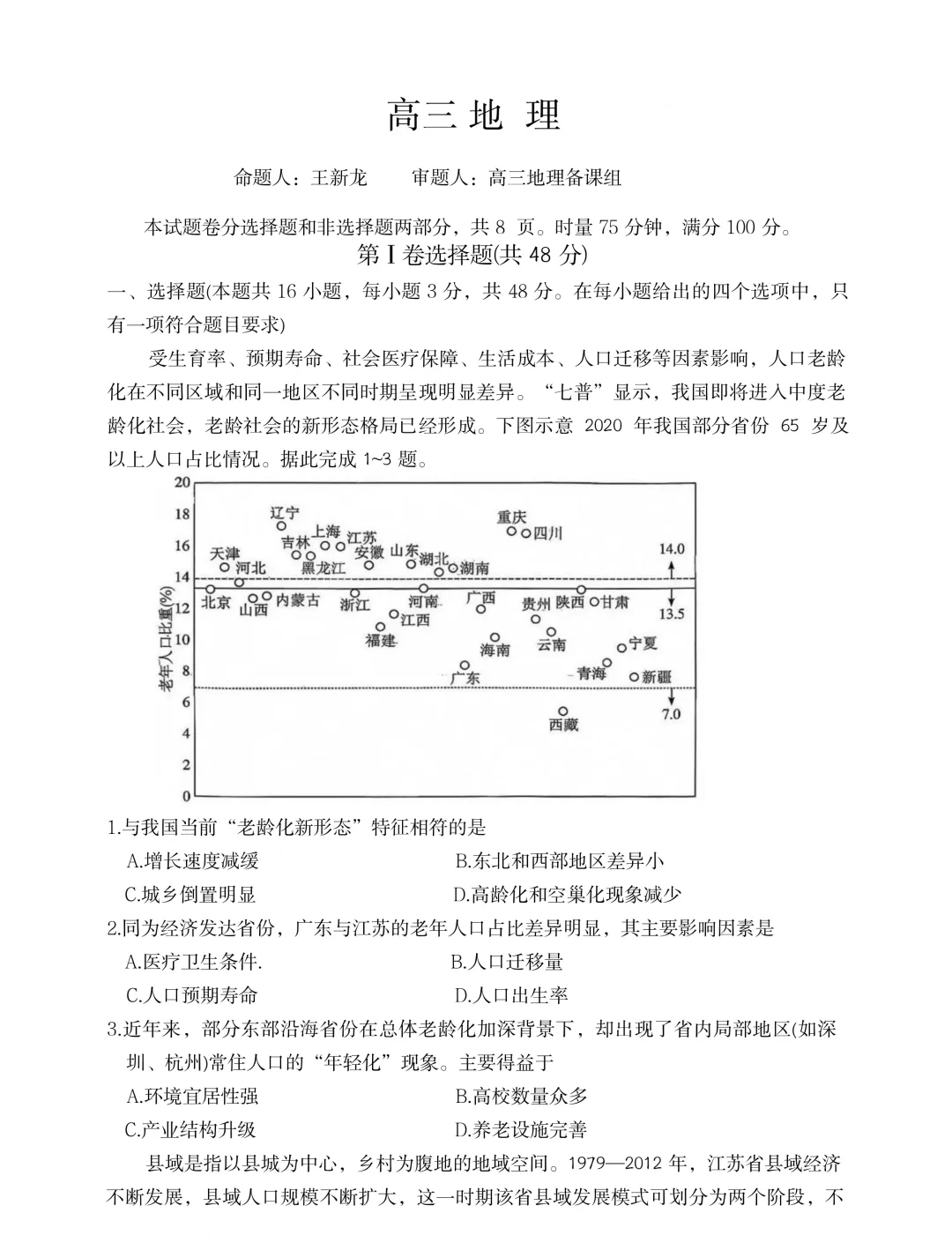 1.C【解析】理论上,在城乡二元结构明显的社会,经济社会发展水平高、医疗条件优越、死亡率水平低和生育率水平低的城镇,人口老龄化进程和程度本应快而高,但我国的现实恰恰相反,乡村地区人口老龄化速度更快、程度更高,形成乡村人口老龄化程度超过城镇的老龄化城乡倒置现象, C 正确;我国当前老龄化增长速度快, A 错误;读图可知,地区发展不均衡,东北老龄化更严重, B 错误;随着人均寿命和老龄化的增长,高龄化和空巢老人增多, D 错误。故选 C 。
